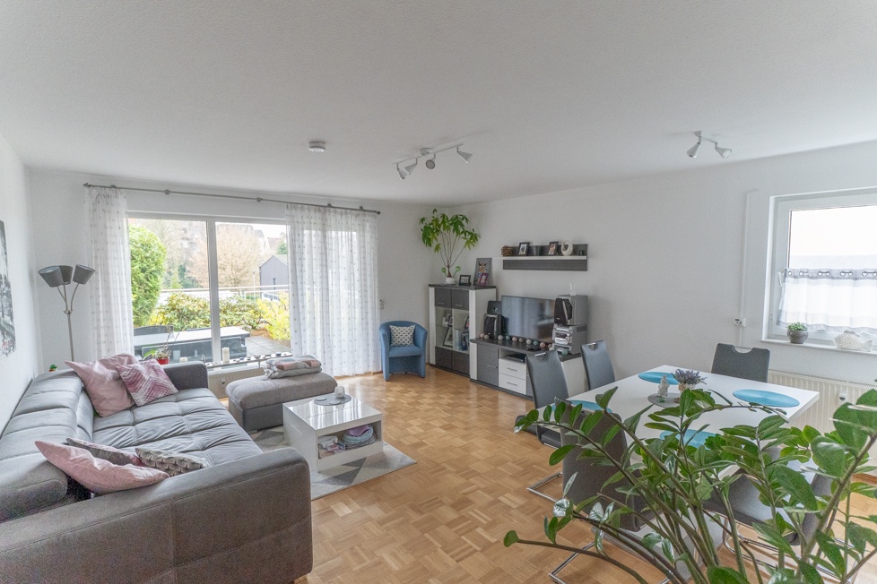 Herzstück der Wohnung ist das ca. 27 m² große Wohn-/ und Esszimmer mit direktem Zugang zur großzügigen, teilüberdachten Terrasse mit Süd-Ost- Ausrichtung.