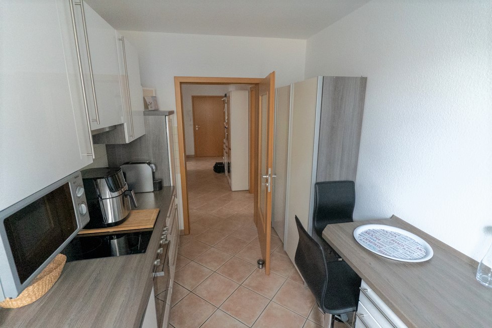 Direkt neben dem Wohn-/ Esszimmer liegt die Küche. Zudem stehen zwei gut geschnittene Schlafzimmer, ein modern gefliestes Tageslichtbad mit Badewanne und Dusche sowie ein innenliegendes Gäste-WC zur Verfügung.