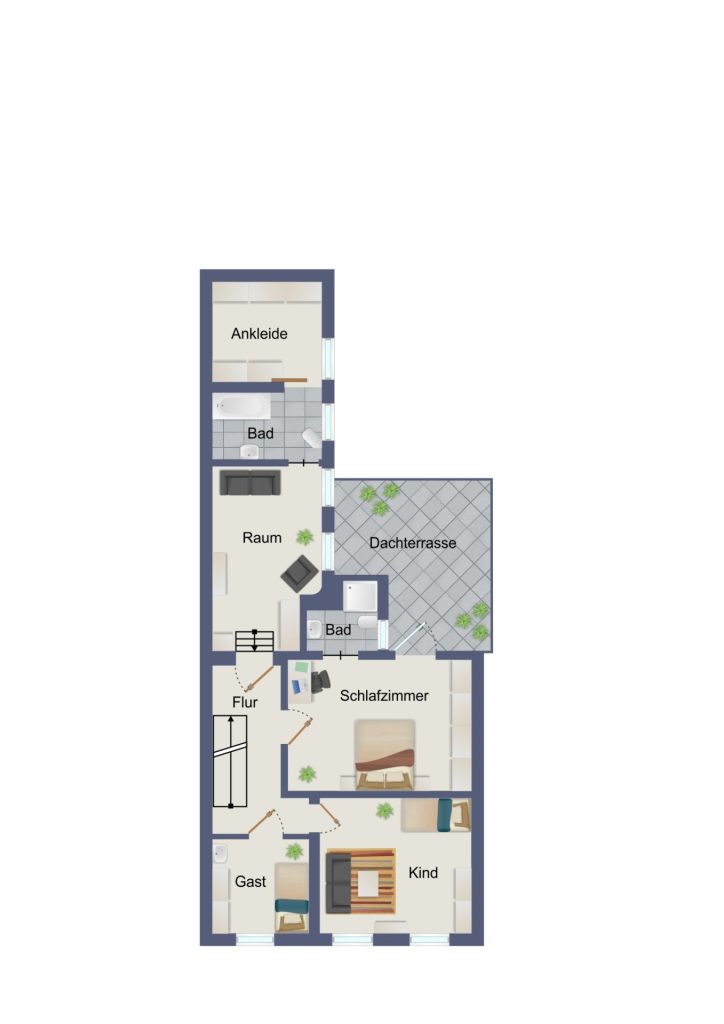 - Badausstattung: Dusche, Badewanne