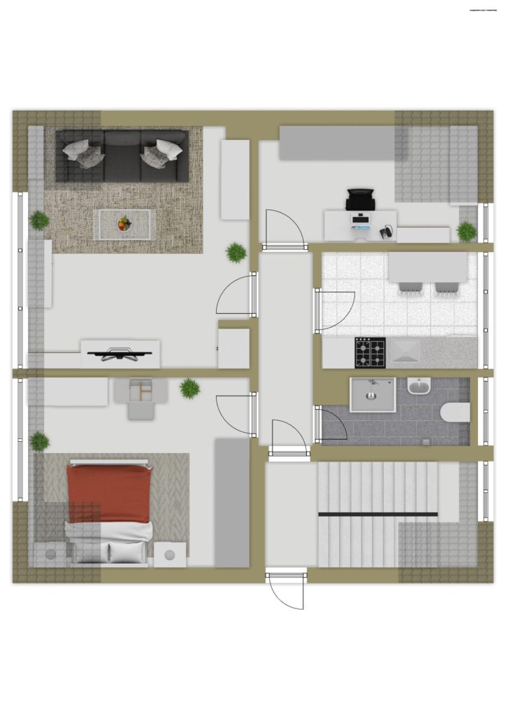 Raumaufteilung: Schlafzimmer, großzügiger Wohnbereich, Büro/Arbeitszimmer, Küche, Tageslichtbad mit Dusche – alle Räume bequem vom zentralen Flur erreichbar