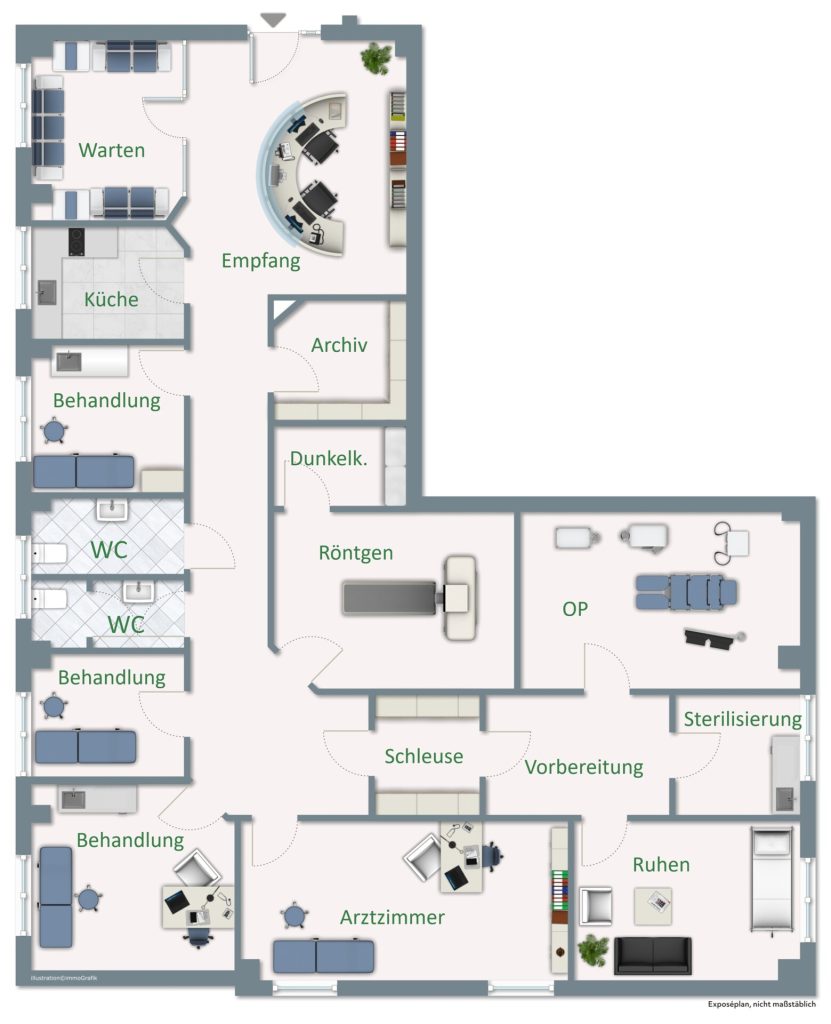 Die Einheit umfasst insgesamt zehn Zimmer, darunter ein Wartezimmer, vier Behandlungs- bzw. Arztzimmer, ein OP-Raum, ein Ruheraum, ein Sterilisationsraum, ein Röntgenzimmer sowie ein Archiv. Ergänzt wird die Fläche durch einen Empfangsbereich, eine Küche, eine Dunkelkammer und zwei separate WC-Anlagen. Die Raumaufteilung ermöglicht effiziente Abläufe im Praxisbetrieb und schafft gleichzeitig eine angenehme Atmosphäre für Patienten und Personal.
