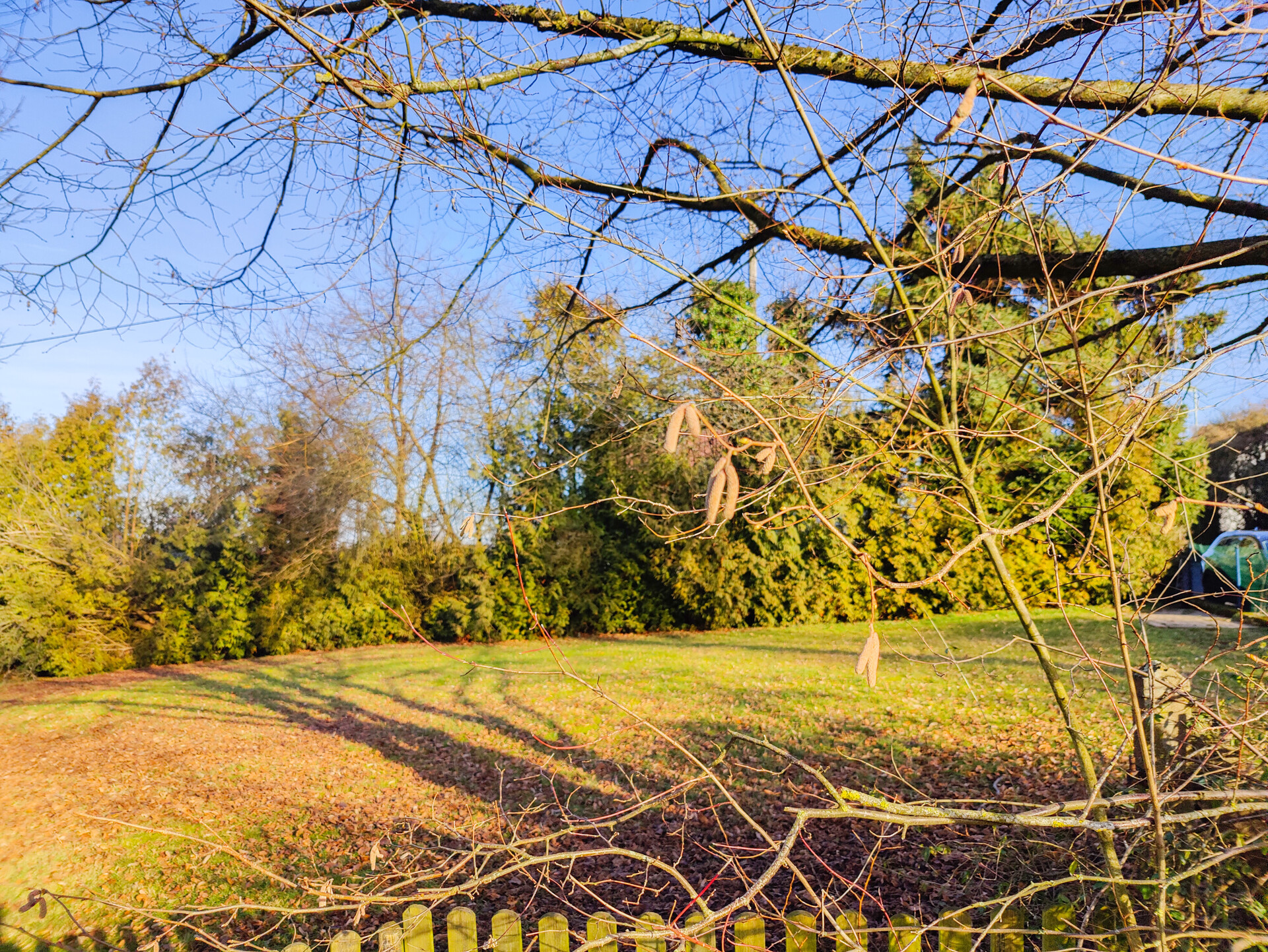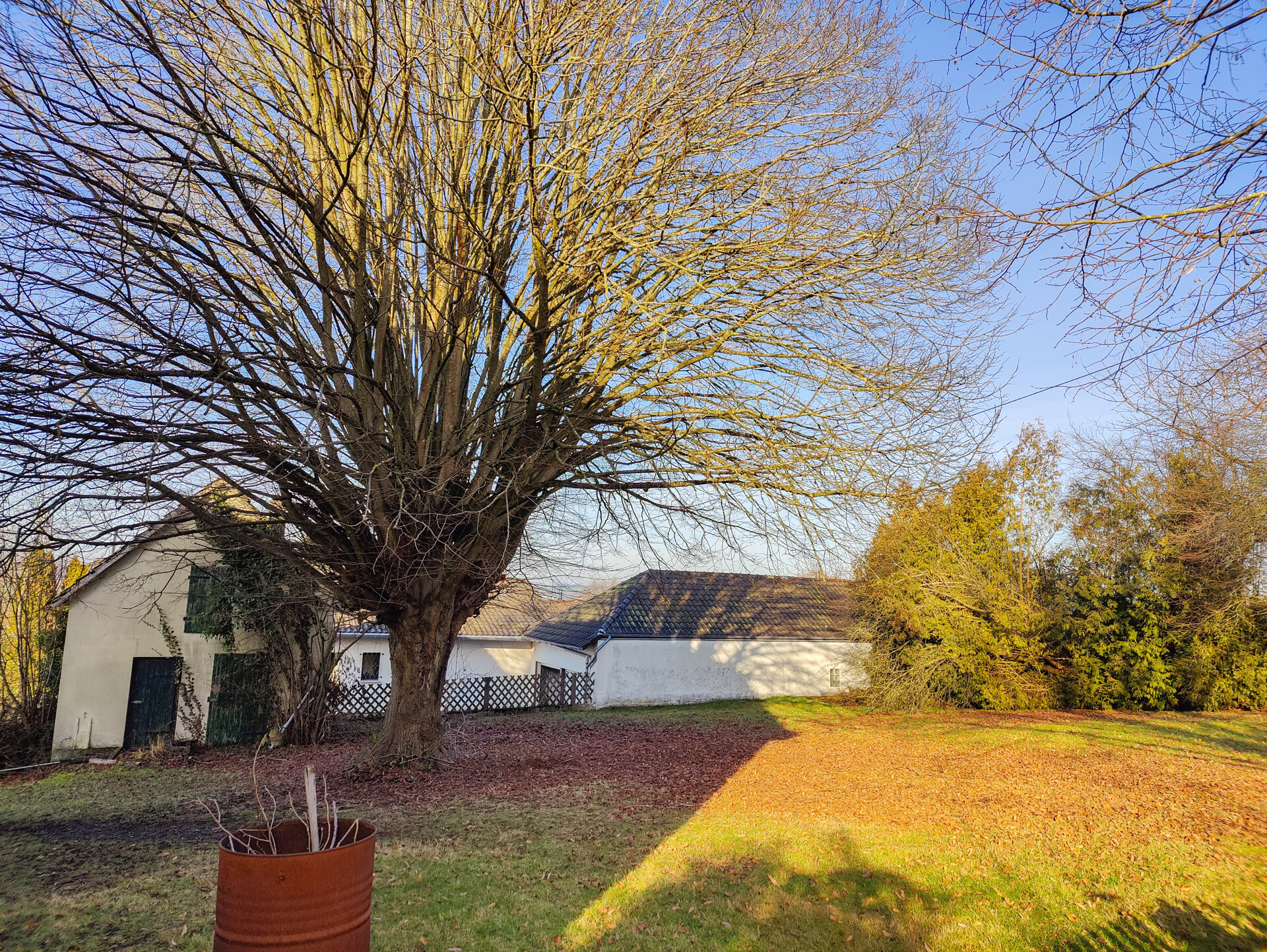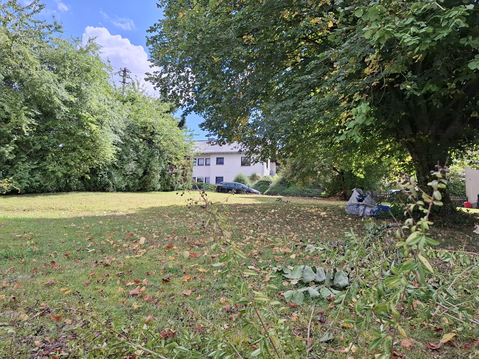 Der Bauplatz wurde teilweise durch Zäune und Hecken eingefriedet. Ein großer Baum spendet an heißen Sommertagen Schatten.