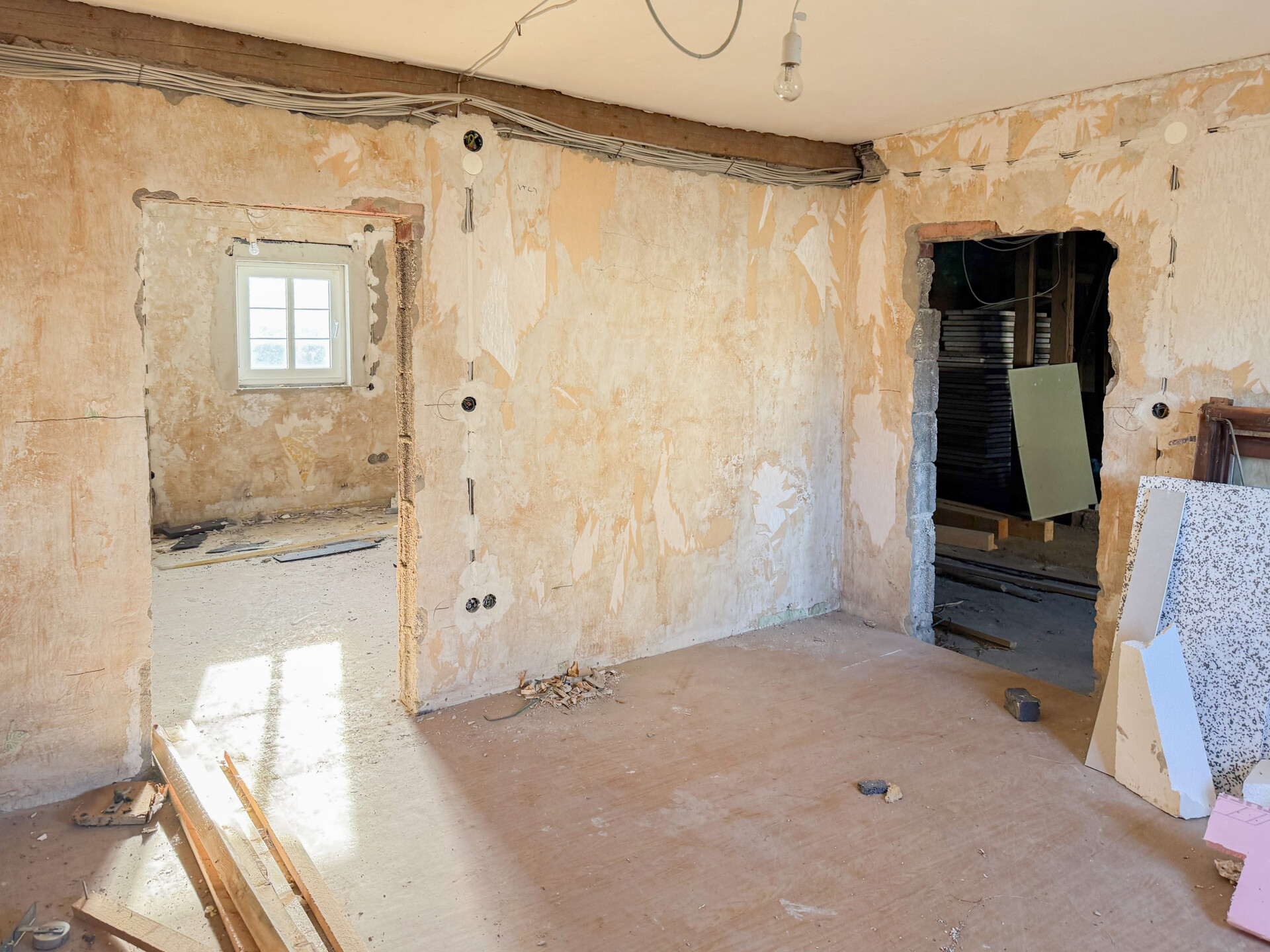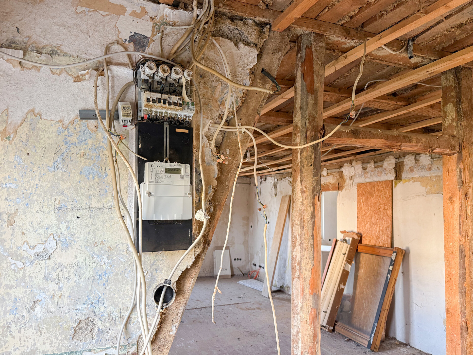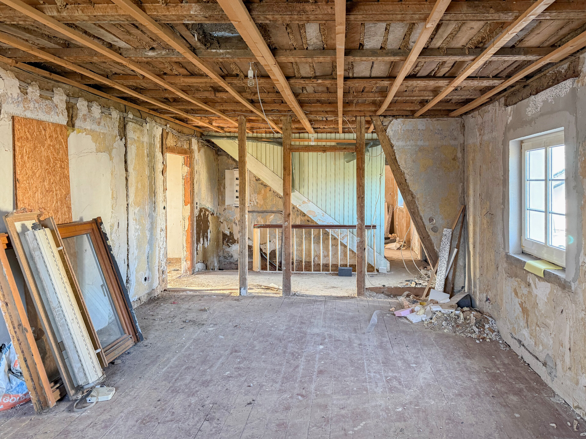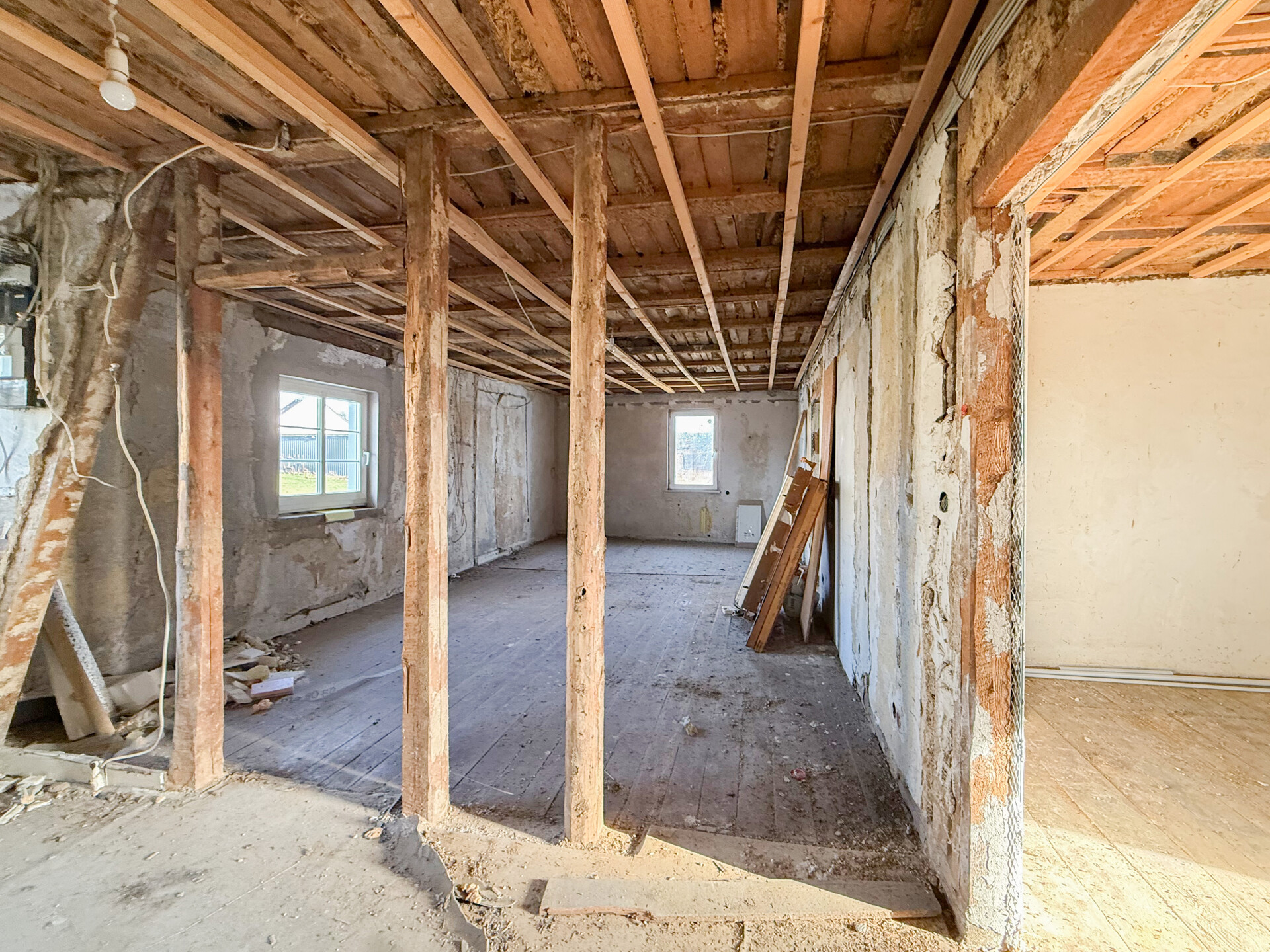 Bei dieser Immobilie handelt es sich um ein ehemaliges Bauernhaus aus schätzungsweise 1919, das seit 2022 bereits im Außenbereich saniert wurde. Im Zuge der Sanierung wurden die Fassade, das Dach sowie die Fenster erneuert. Im linken Gebäudebereich befindet sich eine kleine, bezugsbereite Wohnung, bestehend aus Küche, Wohnzimmer, Duschbad und Schlafzimmer. Der Innenbereich des rechten Gebäudeteils befindet sich im entkernten Zustand. Sämtliche Innenausbauten wurden entfernt, das Gebäude präsentiert sich im Rohbauzustand mit freigelegten Wänden, Decken, Böden. Erste Arbeiten an der Elektrik wurden bereits begonnen, jedoch noch nicht abgeschlossen. Die Elektrioverteilung im OG wurde komplett verlegt. Es bietet vielfältige Ausbaureserven zur individuellen Gestaltung von zusätzlichem Wohnraum. Ursprünglich war der Ausbau zu einem Mehrfamilienhaus mit 2 weiteren Einheiten vorgesehen, wodurch sich das Objekt besonders für handwerklich versierte Käufer oder Investoren eignet, die den verbleibenden Sanierungsaufwand bewusst einkalkulieren. Nach Fertigstellung könnte eine Wohnfläche von schätzungsweise 350 m² erzielt werden.