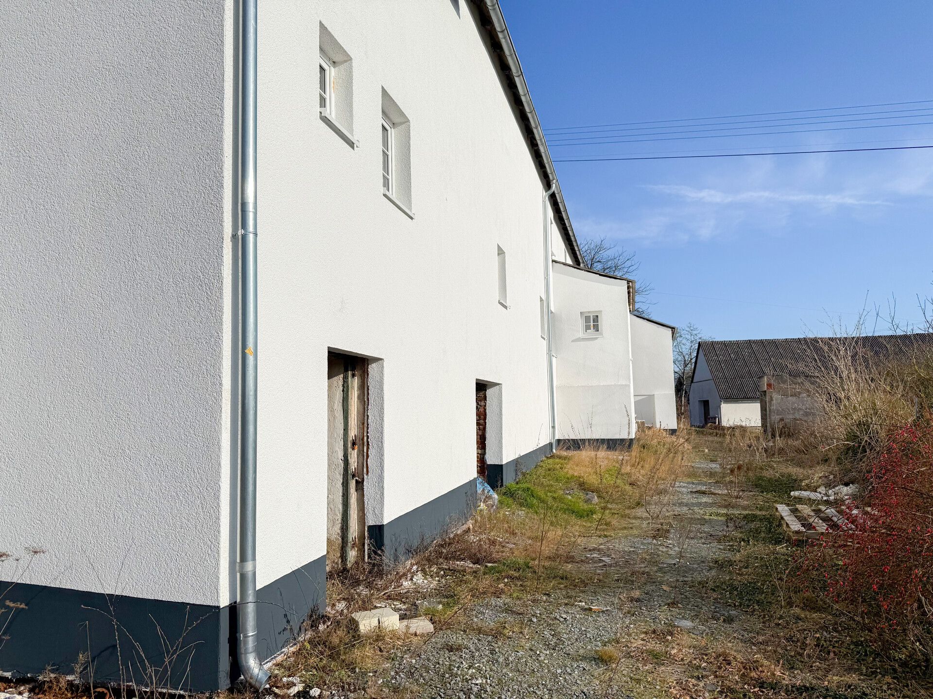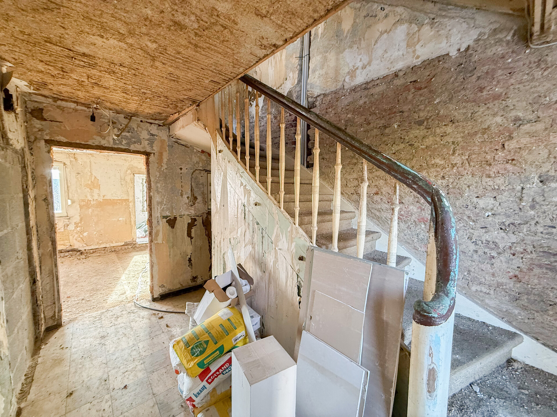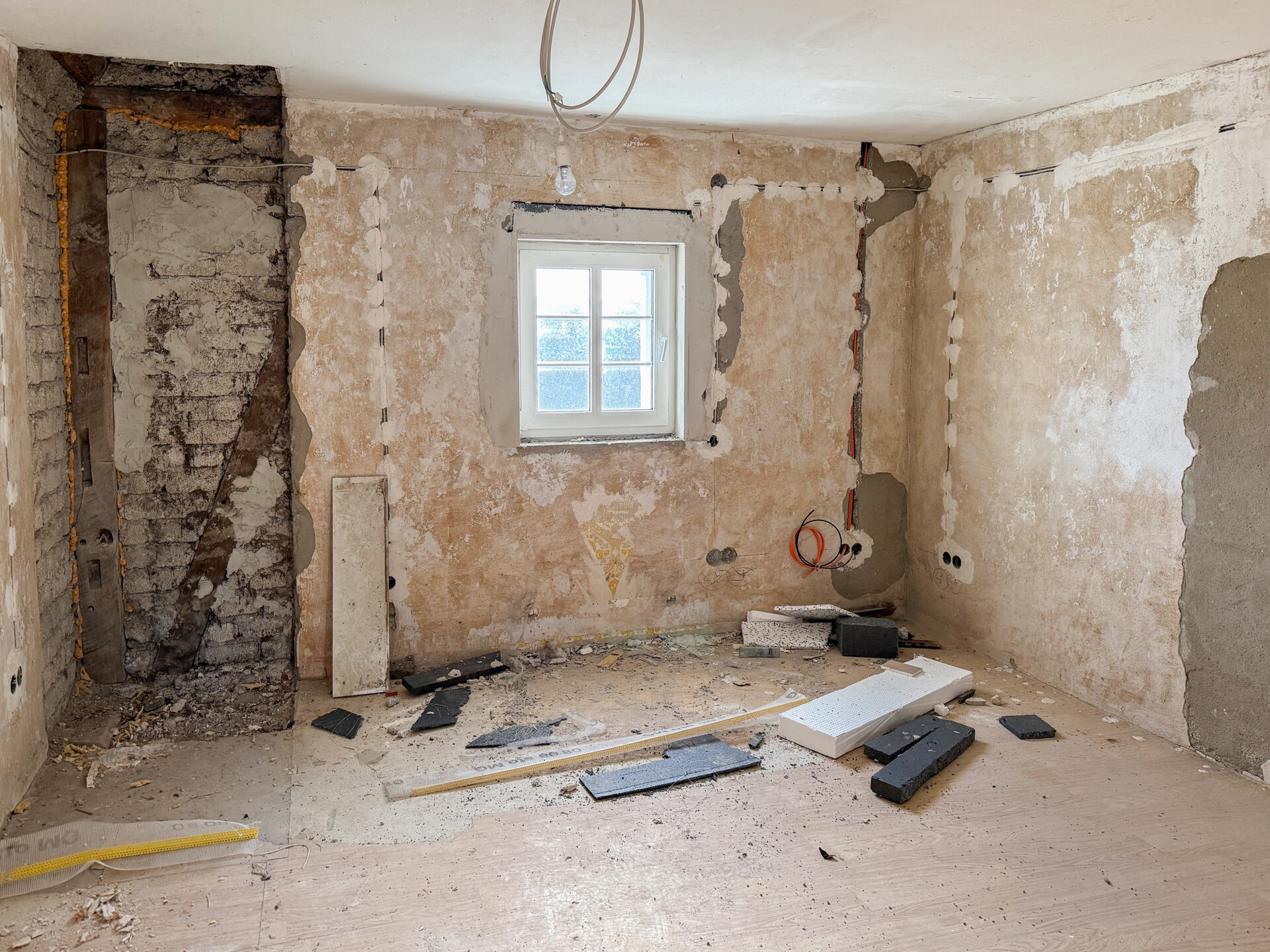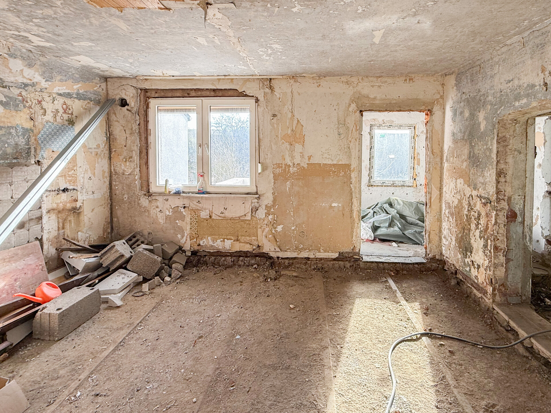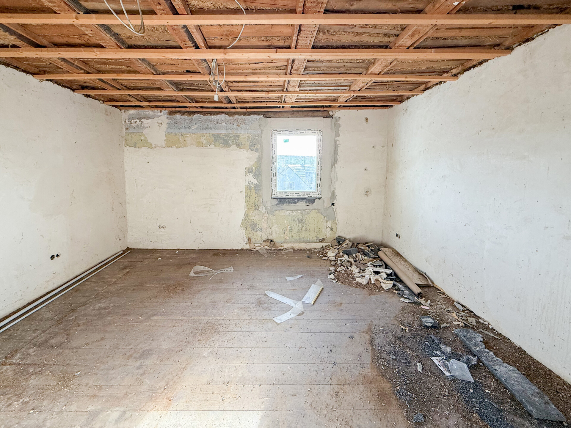 Bei dieser Immobilie handelt es sich um ein ehemaliges Bauernhaus aus schätzungsweise 1919, das seit 2022 bereits im Außenbereich saniert wurde. Im Zuge der Sanierung wurden die Fassade, das Dach sowie die Fenster erneuert. Im linken Gebäudebereich befindet sich eine kleine, bezugsbereite Wohnung, bestehend aus Küche, Wohnzimmer, Duschbad und Schlafzimmer. Der Innenbereich des rechten Gebäudeteils befindet sich im entkernten Zustand. Sämtliche Innenausbauten wurden entfernt, das Gebäude präsentiert sich im Rohbauzustand mit freigelegten Wänden, Decken, Böden. Erste Arbeiten an der Elektrik wurden bereits begonnen, jedoch noch nicht abgeschlossen. Die Elektrioverteilung im OG wurde komplett verlegt. Es bietet vielfältige Ausbaureserven zur individuellen Gestaltung von zusätzlichem Wohnraum. Ursprünglich war der Ausbau zu einem Mehrfamilienhaus mit 2 weiteren Einheiten vorgesehen, wodurch sich das Objekt besonders für handwerklich versierte Käufer oder Investoren eignet, die den verbleibenden Sanierungsaufwand bewusst einkalkulieren. Nach Fertigstellung könnte eine Wohnfläche von schätzungsweise 350 m² erzielt werden.
