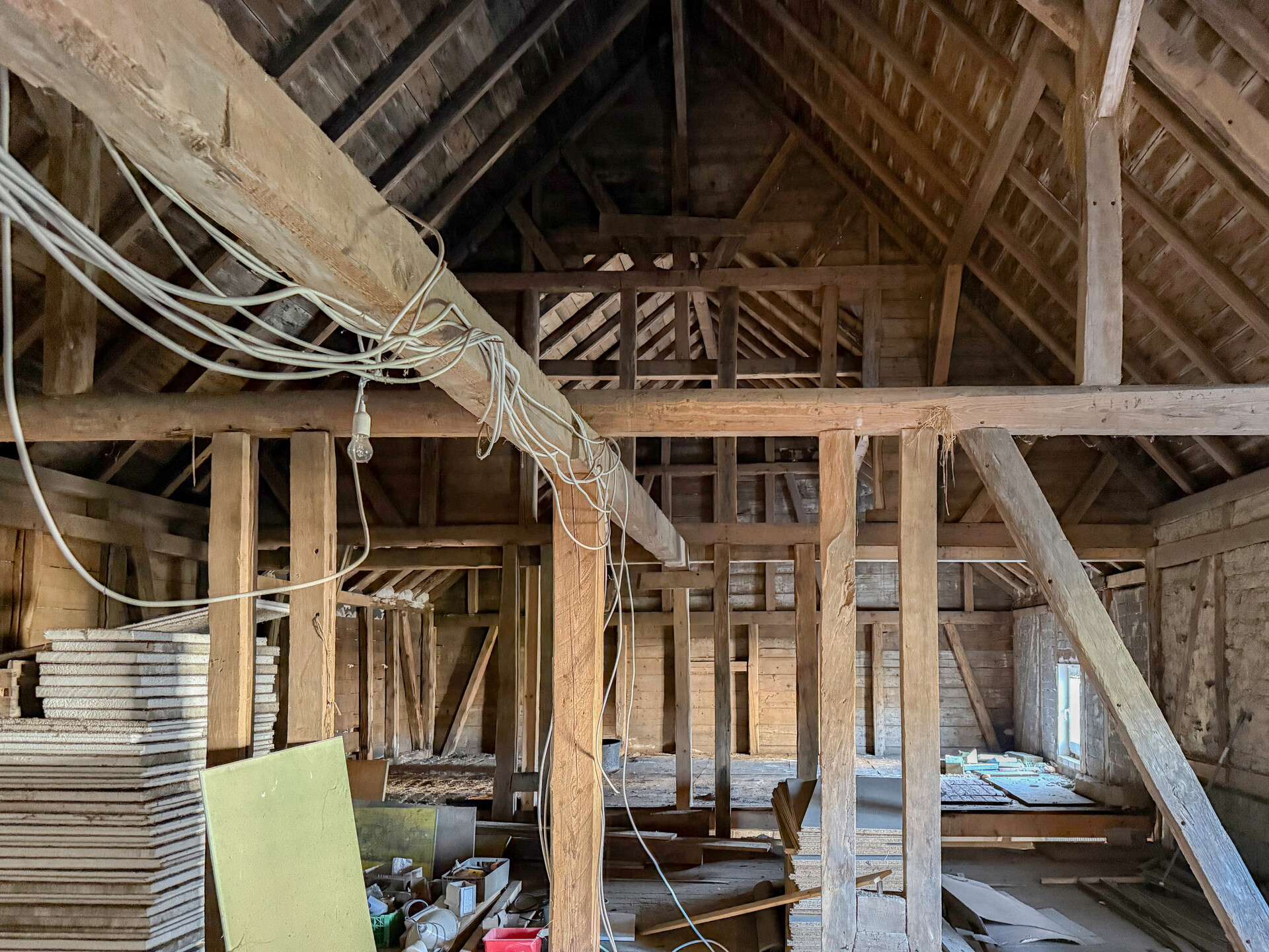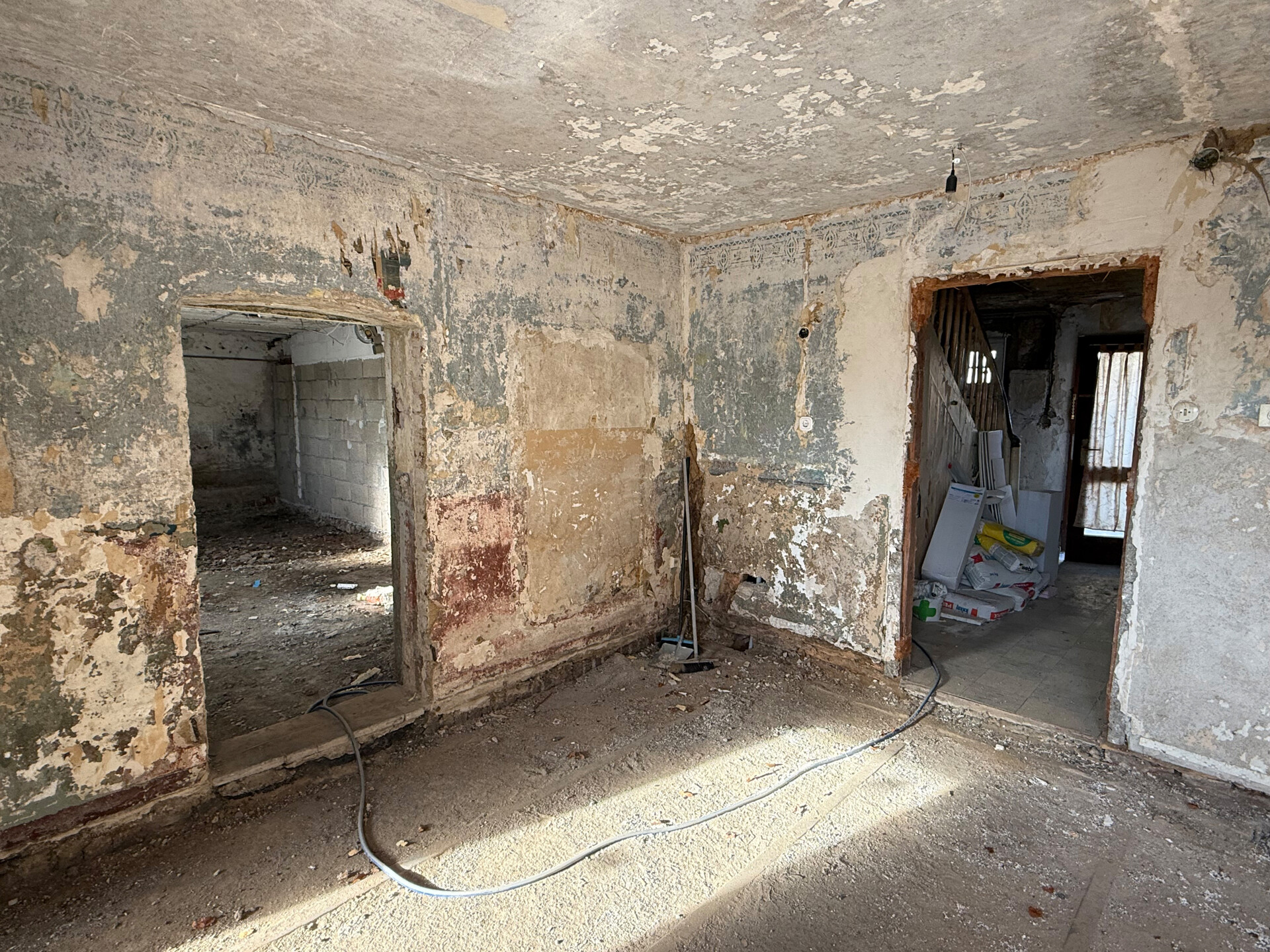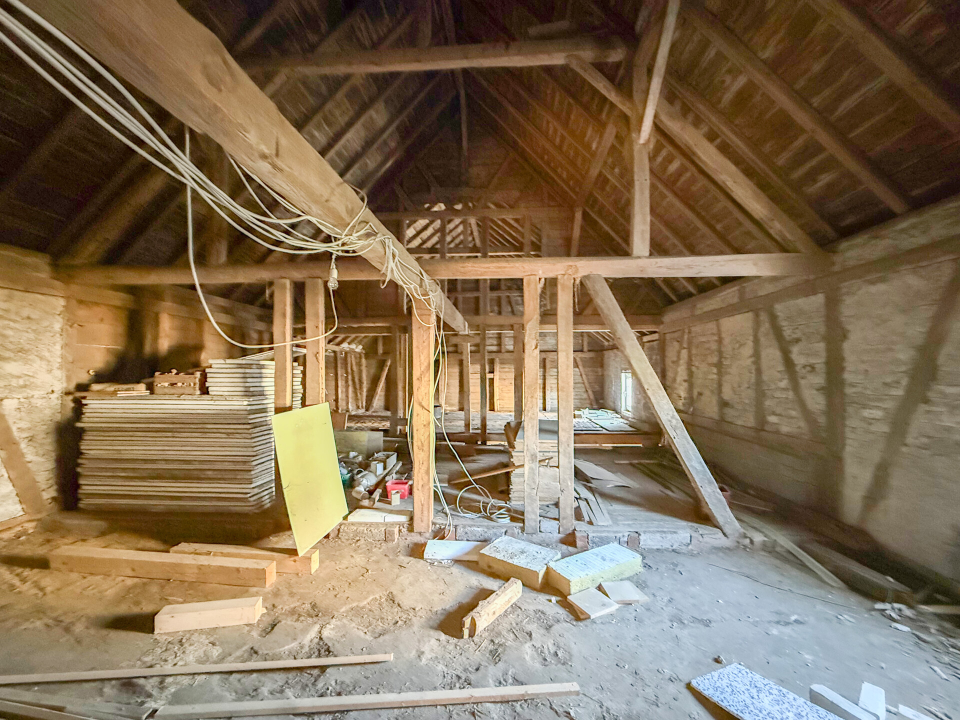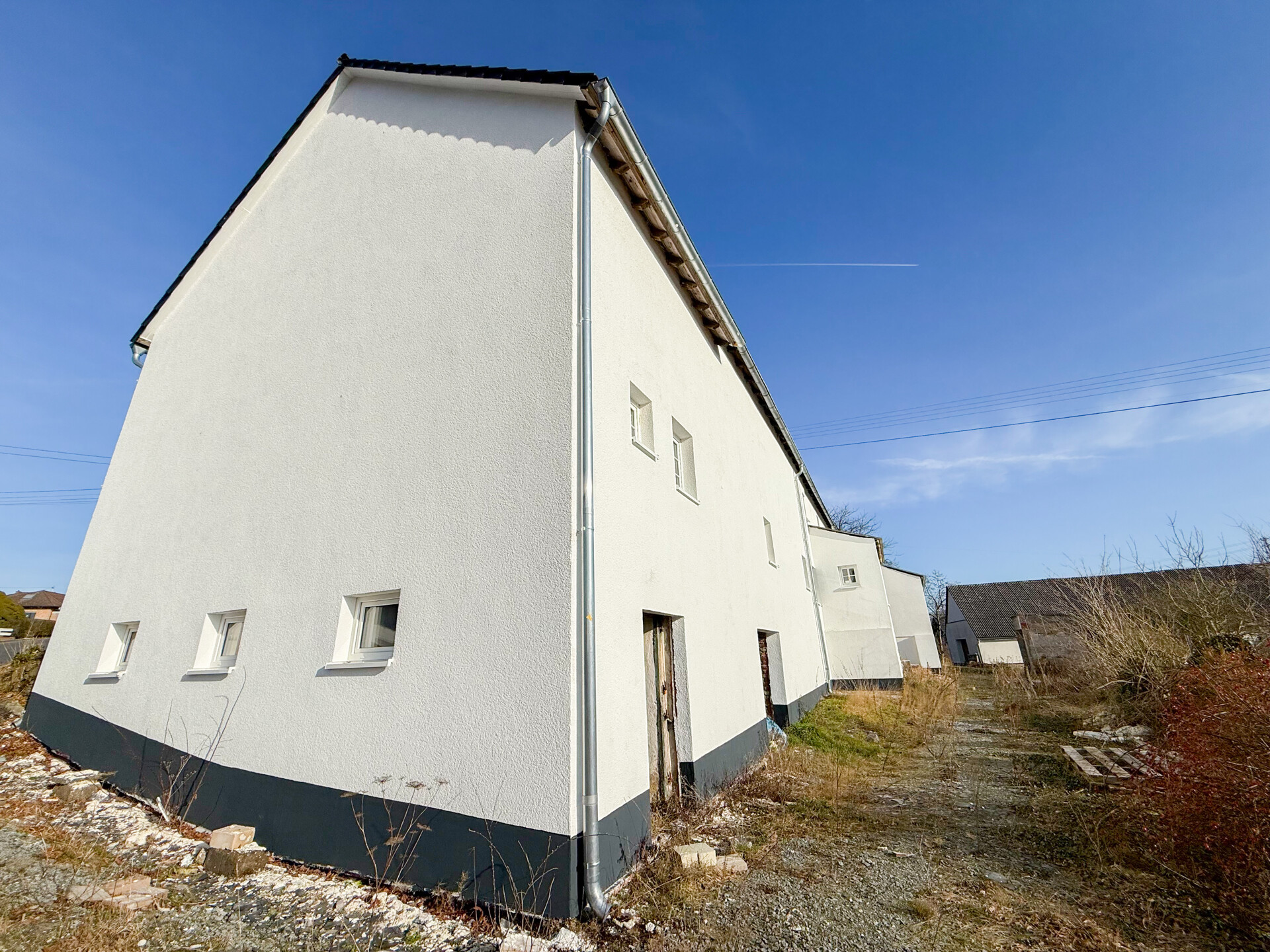 Bei dieser Immobilie handelt es sich um ein ehemaliges Bauernhaus aus schätzungsweise 1919, das seit 2022 bereits im Außenbereich saniert wurde. Im Zuge der Sanierung wurden die Fassade, das Dach sowie die Fenster erneuert. Im linken Gebäudebereich befindet sich eine kleine, bezugsbereite Wohnung, bestehend aus Küche, Wohnzimmer, Duschbad und Schlafzimmer. Der Innenbereich des rechten Gebäudeteils befindet sich im entkernten Zustand. Sämtliche Innenausbauten wurden entfernt, das Gebäude präsentiert sich im Rohbauzustand mit freigelegten Wänden, Decken, Böden. Erste Arbeiten an der Elektrik wurden bereits begonnen, jedoch noch nicht abgeschlossen. Die Elektrioverteilung im OG wurde komplett verlegt. Es bietet vielfältige Ausbaureserven zur individuellen Gestaltung von zusätzlichem Wohnraum. Ursprünglich war der Ausbau zu einem Mehrfamilienhaus mit 2 weiteren Einheiten vorgesehen, wodurch sich das Objekt besonders für handwerklich versierte Käufer oder Investoren eignet, die den verbleibenden Sanierungsaufwand bewusst einkalkulieren. Nach Fertigstellung könnte eine Wohnfläche von schätzungsweise 350 m² erzielt werden.