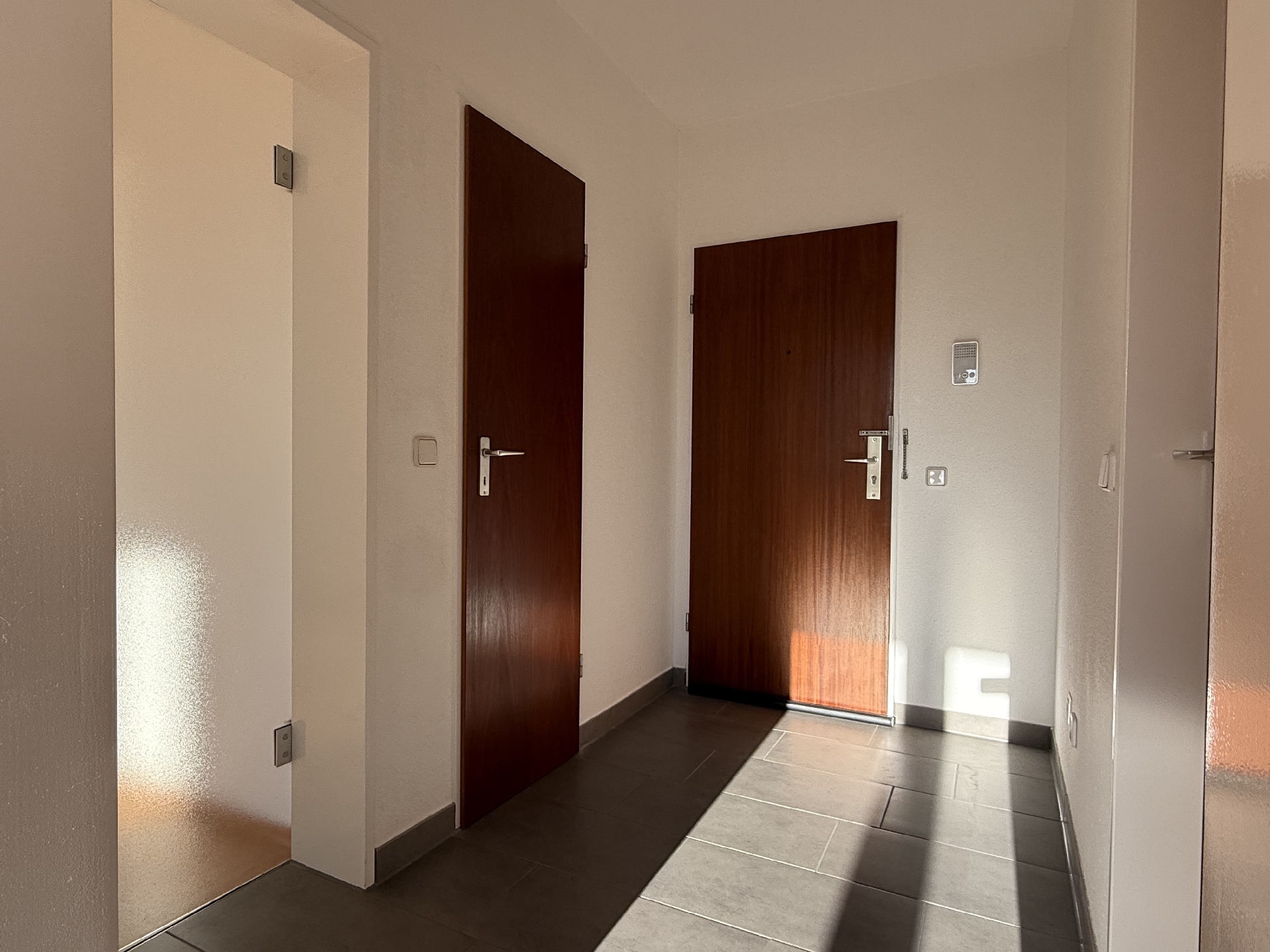 – graue Bodenfliesen in Flur, Abstellraum und Kochnische