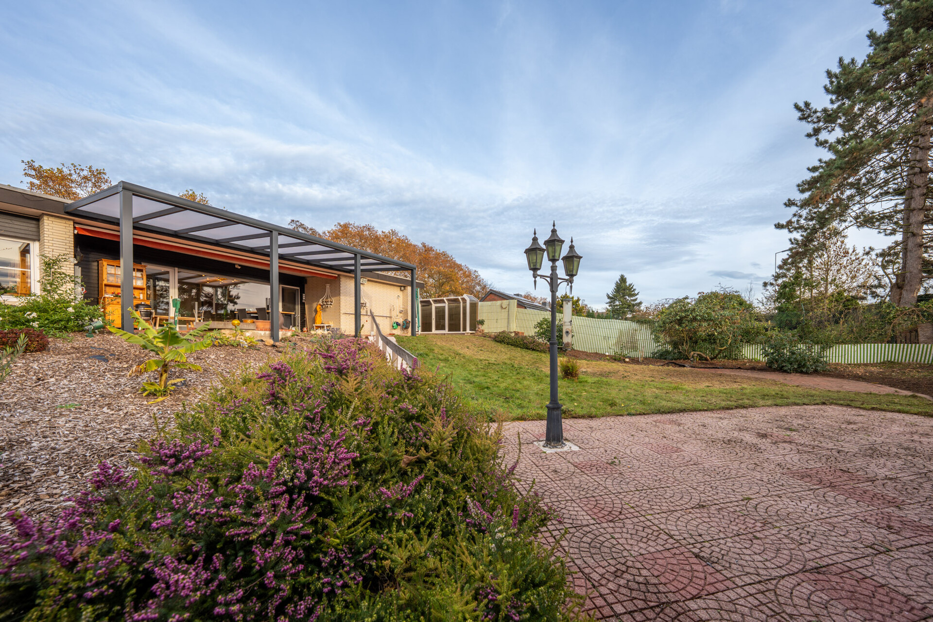 Der gepflegte Garten mit überdachter Terrasse ist ein Ort zum Durchatmen – hier können Sie die Natur genießen, Feste feiern oder einfach die Seele baumeln lassen.