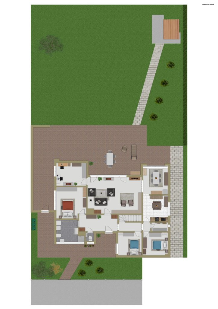 Der große Wohnbereich mit Zugang zur überdachten Terrasse lädt zu entspannten Abenden und geselligen Stunden ein. Ein weiteres Zimmer eröffnet Ihnen die Möglichkeit, ein Büro oder Hobbyraum einzurichten – ideal für modernes Wohnen und Arbeiten unter einem Dach. Besonders komfortabel: Durch die lange Garage gelangen Sie trockenen Fußes direkt in den Kellerbereich und damit ins Haus, ein Detail, das gerade in den kühleren Monaten für spürbare Bequemlichkeit sorgt.