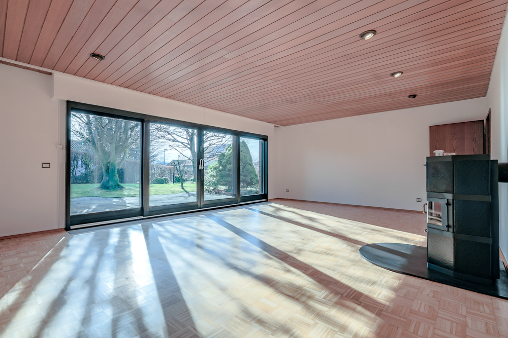*Großer Wohn-Essbereich mit Parkettboden, Kaminofen und Panoramafensterscheiben zur Terrasse,