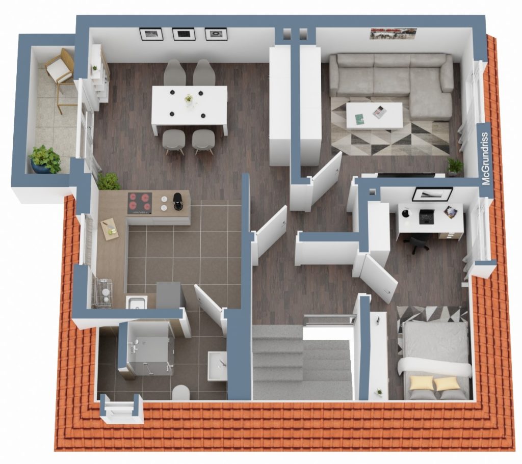 Das Haus bietet insgesamt ca. 200 m² Wohn-/ Nutzfläche, verteilt auf drei gut geschnittene Wohneinheiten. Im Erdgeschoss und Obergeschoss befinden sich jeweils 3-Zimmer-Wohnungen. Aktuell verfügt die Erdgeschosswohnung jedoch nur über zwei Zimmer, da durch das Entfernen einer Wand ein großzügig offen gestalteter Wohn-/ und Essbereich geschaffen wurde. Im Dachgeschoss befindet sich eine 2-Zimmer-Wohnung mit offenem Wohn-/ und Küchenbereich. Darüber hinaus steht im Dachgeschoss ein zusätzlich, separat gelegenes Arbeitszimmer zur Verfügung.