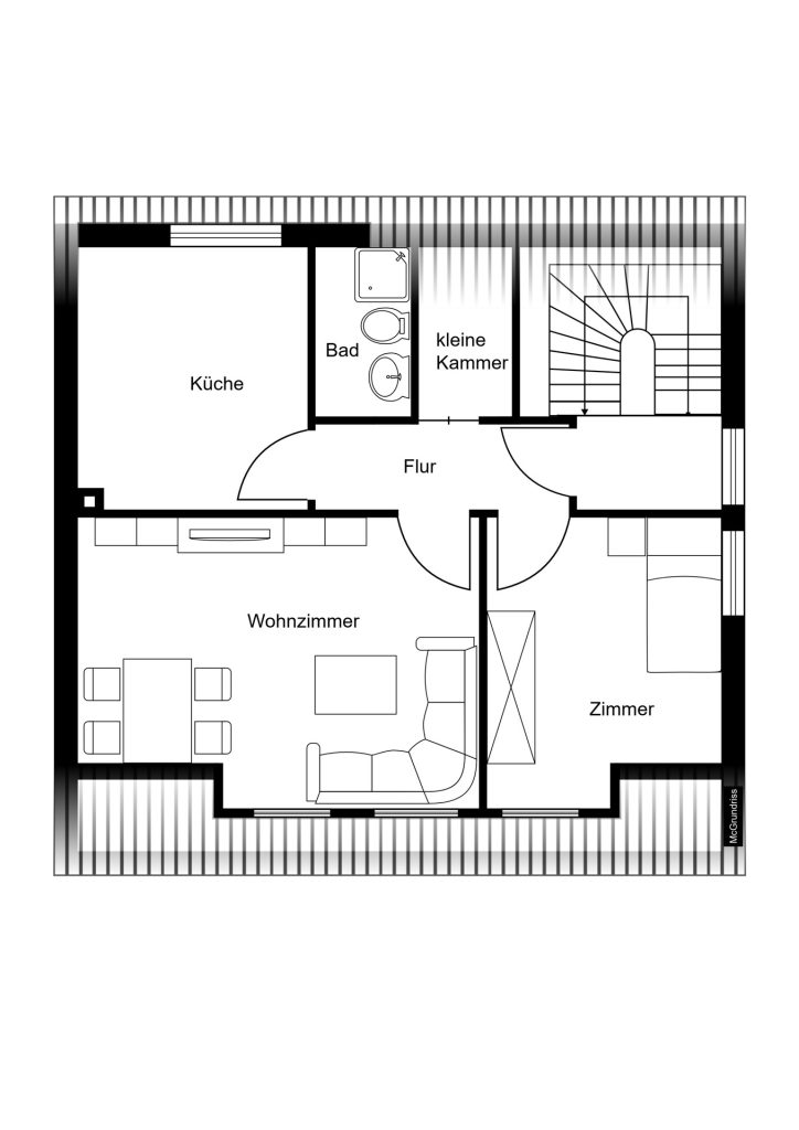 Das Haus ist voll unterkellert und verfügt über ein ausgebautes Dachgeschoss, welches bereits im Jahr 1955 erweitert wurde. Die Geschosse vom Erdgeschoss bis zum Dachgeschoss weisen einen nahezu identischen Schnitt auf und bieten jeweils drei gut geschnittene Zimmer, wodurch sich vielseitige Nutzungsmöglichkeiten – beispielsweise für Familien oder Mehrgenerationenwohnen – ergeben.