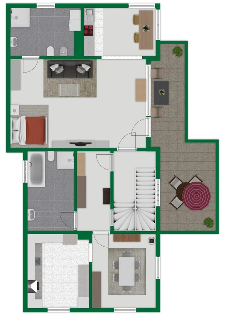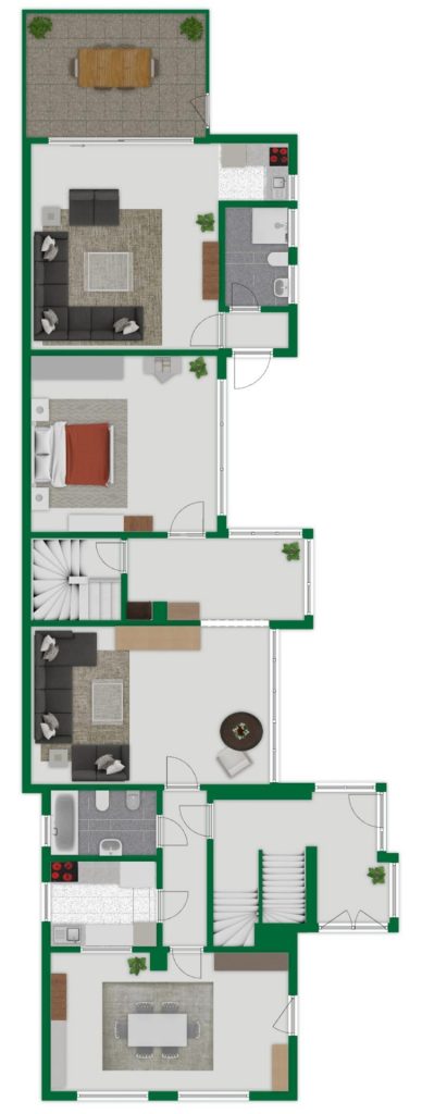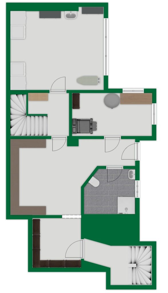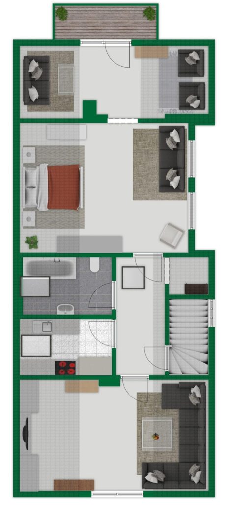 Zusätzlich gibt es im Erdgeschoss noch einen in Wohnraumqualität ausgebauten Raum mit einem Badezimmer und angeschlossener Terrasse.