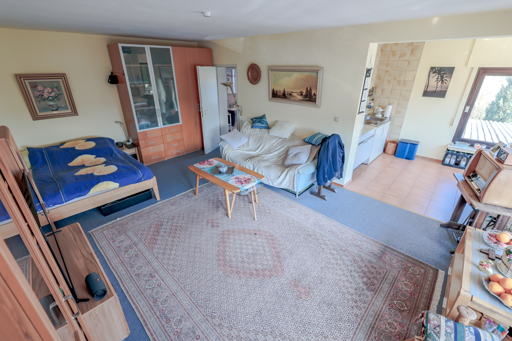 Zusätzlich gibt es im Erdgeschoss noch einen in Wohnraumqualität ausgebauten Raum mit einem Badezimmer und angeschlossener Terrasse.