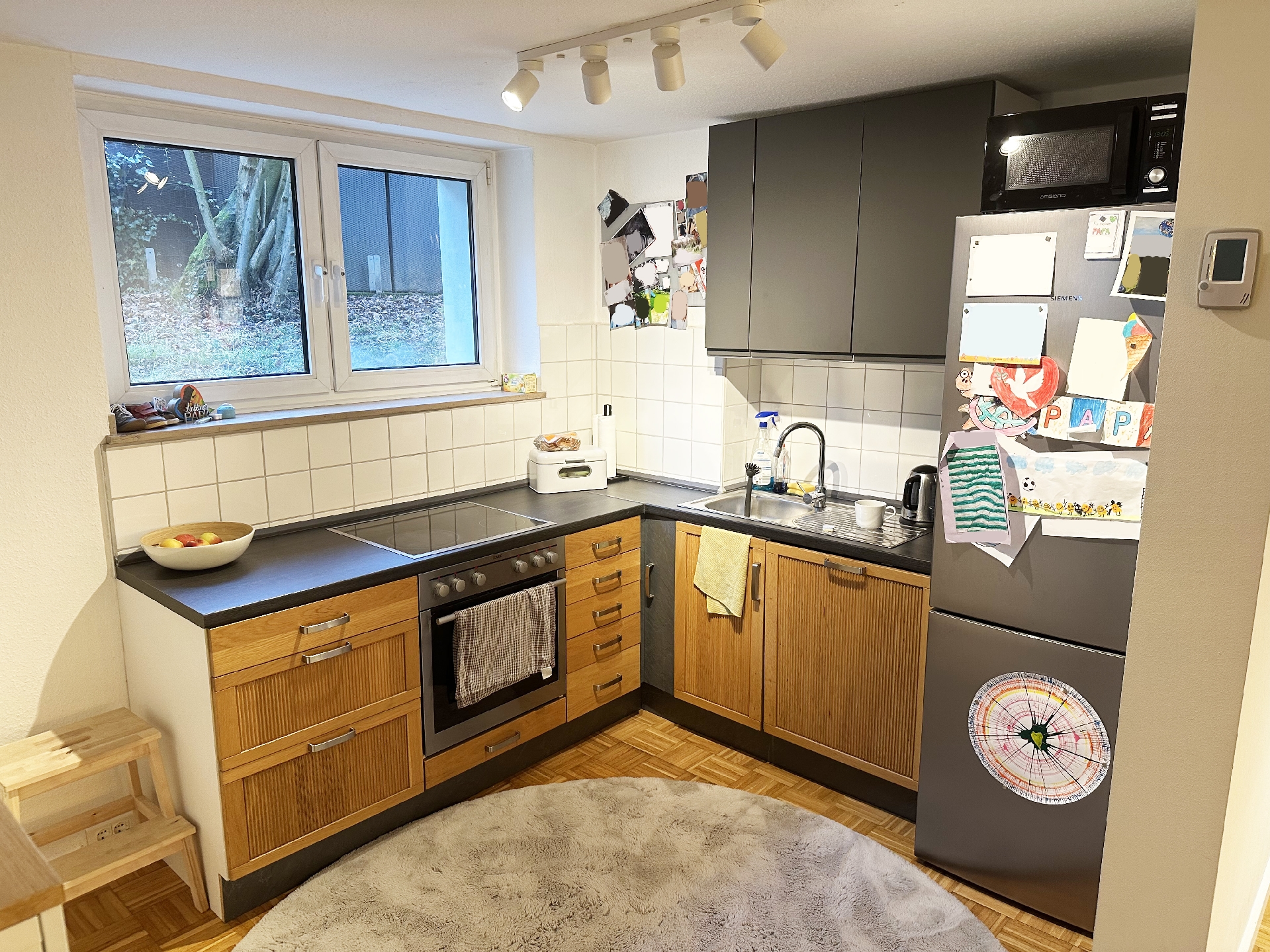 Die Wohnung befindet sich im Souterrain eines 3-Parteien-Hauses. Vom Entrée geht es zum geräumigen Schlafzimmer mit viel Stellfläche, ins Wannenbad (mit Fenster) sowie in das großzügig bemessenene Wohn-Esszimmer mit offener Küche. Der Gartenanteil rechts neben dem Haus kann von den Mietern der Wohnung mitgenutzt werden.