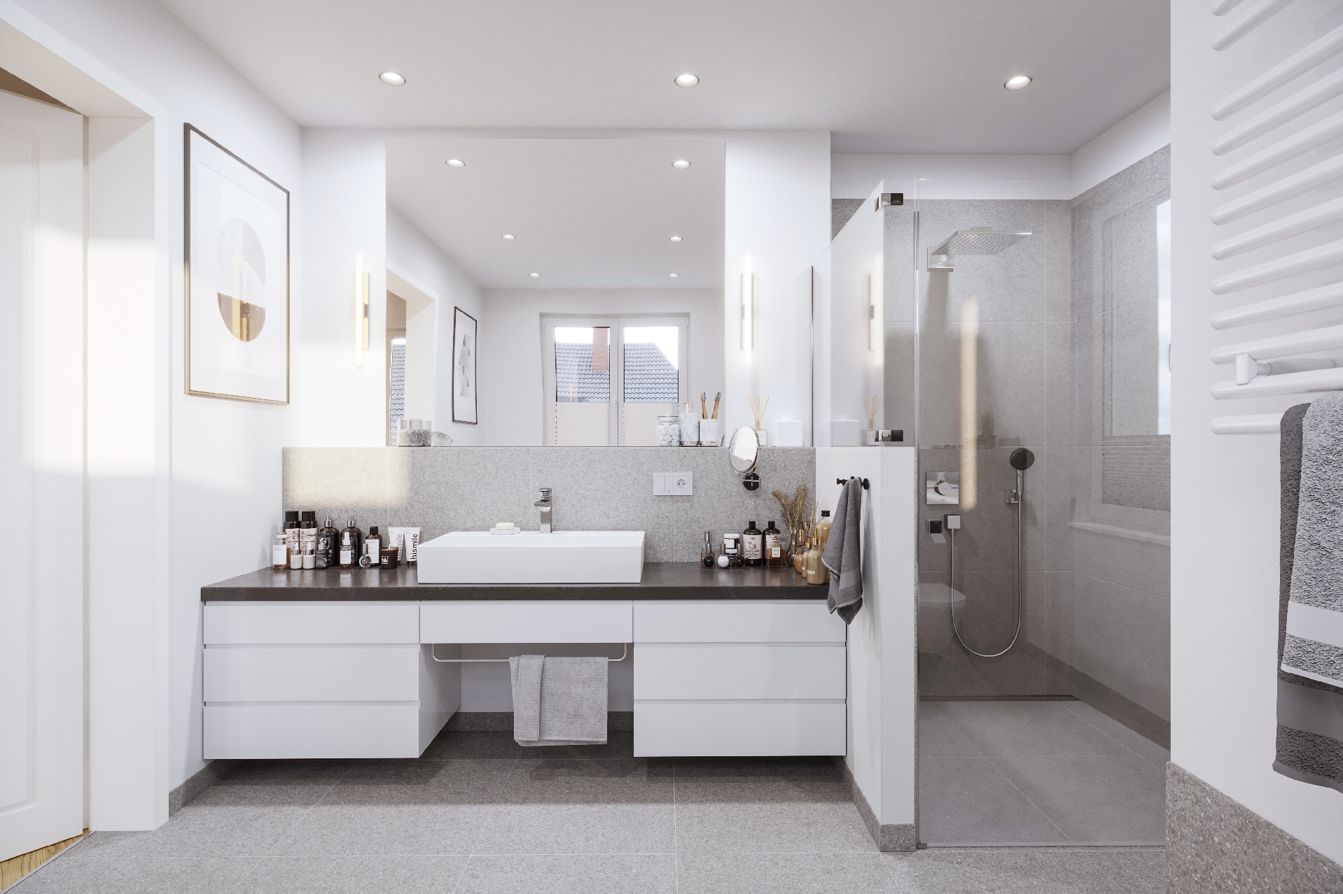 Das Haus erhält – wie die Wohnungen – eine hochwertige Ausstattung: Hierzu gehören die Einhaltung der Rahmenbedingungen eines `Effizienshauses 40´ mit Luft-Wasser-Wärmepumpe, Photovoltaikanlage und einer nachhaltigen Massivbauweise.