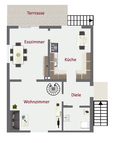 Der Eingangsbereich des Hauses führt Sie direkt zur Diele, die Zugang zum großzügigen Gäste-WC bietet, das ausreichend Platz für eine Dusche bereithält. Die Küche ist sowohl von der Diele als auch vom Esszimmer aus zugänglich und bietet genug Raum für einen Esstisch. Das behagliche Wohnzimmer ist ebenfalls direkt mit dem Esszimmer verbunden. Von dort aus erreichen Sie die weitläufige Terrasse, die mit ihrer Treppe direkt in den wunderschönen, großen Garten führt.