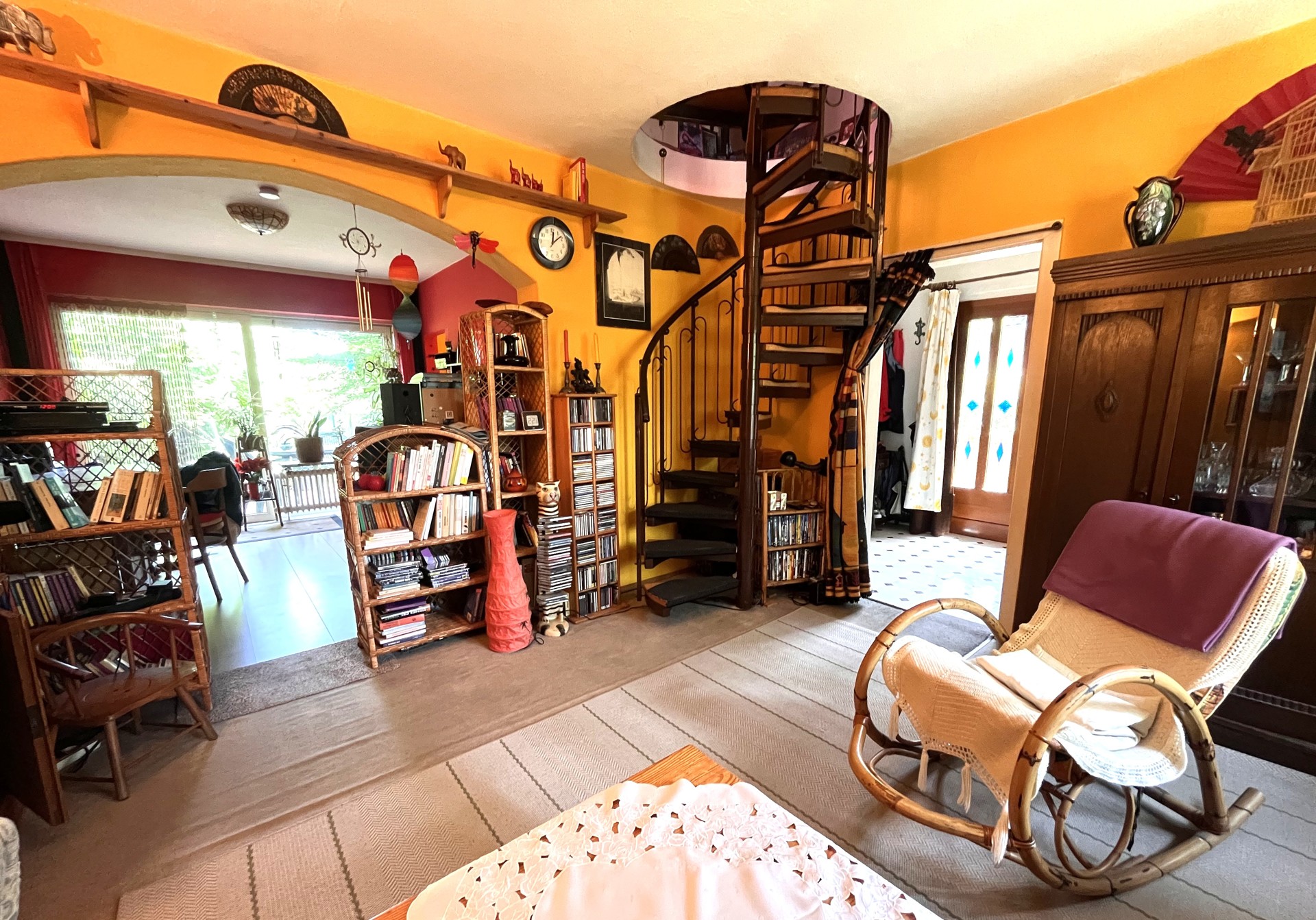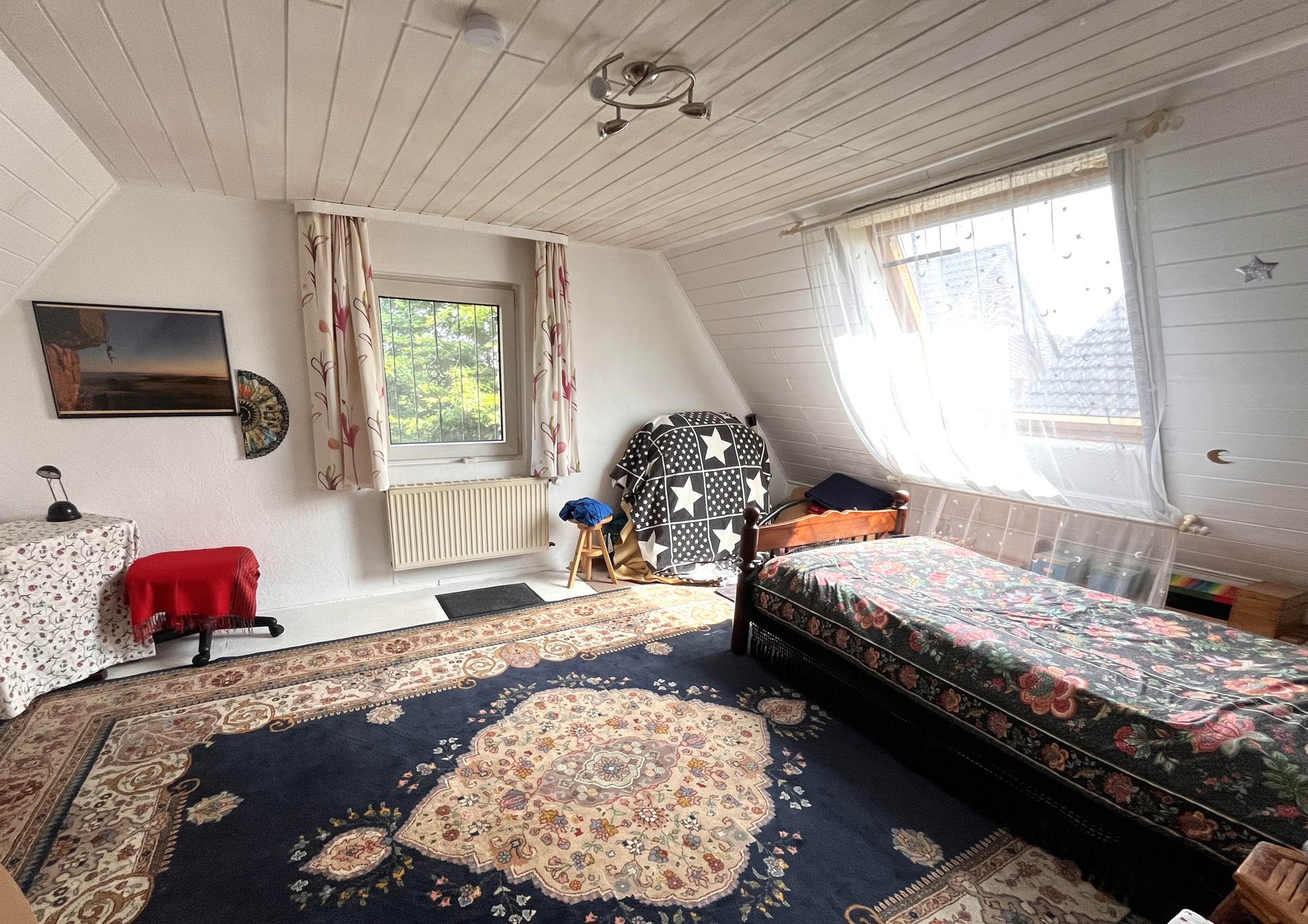Im Obergeschoss gelangen Sie über eine Wendeltreppe aus dem Wohnzimmer. Diese Etage bietet ein geräumiges, lichtdurchflutetes Schlafzimmer sowie ein großzügiges Wannenbad mit Fenster. Die Diele im Obergeschoss ist ebenfalls geräumig und vielseitig nutzbar.