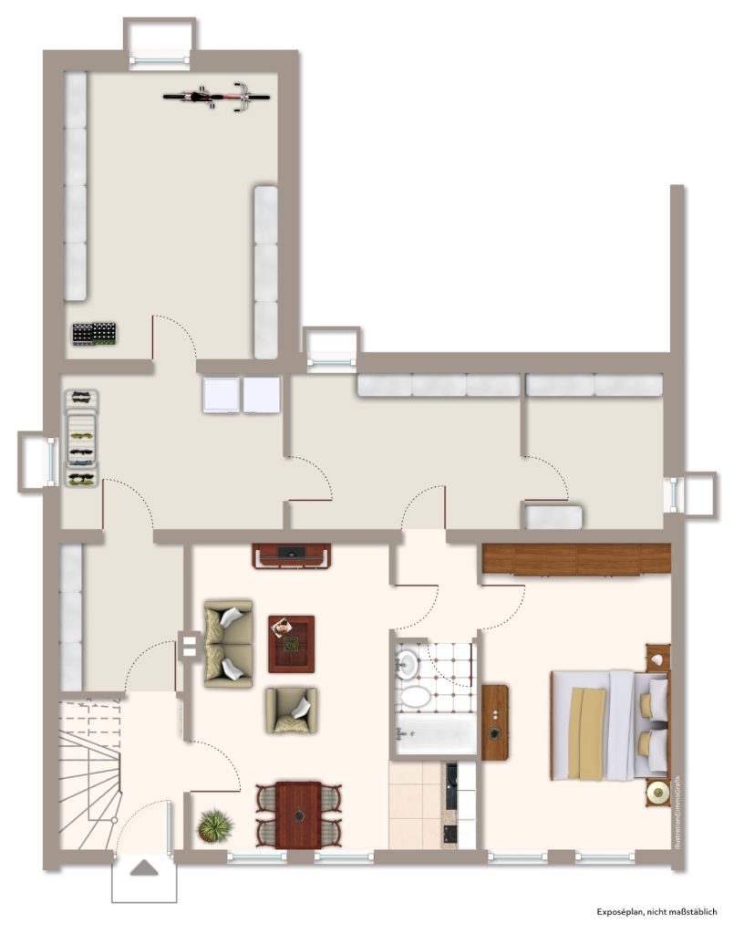 Keller: vorderer Teil Einliegerwohnung, hinterer Teil Kellerbereich.
