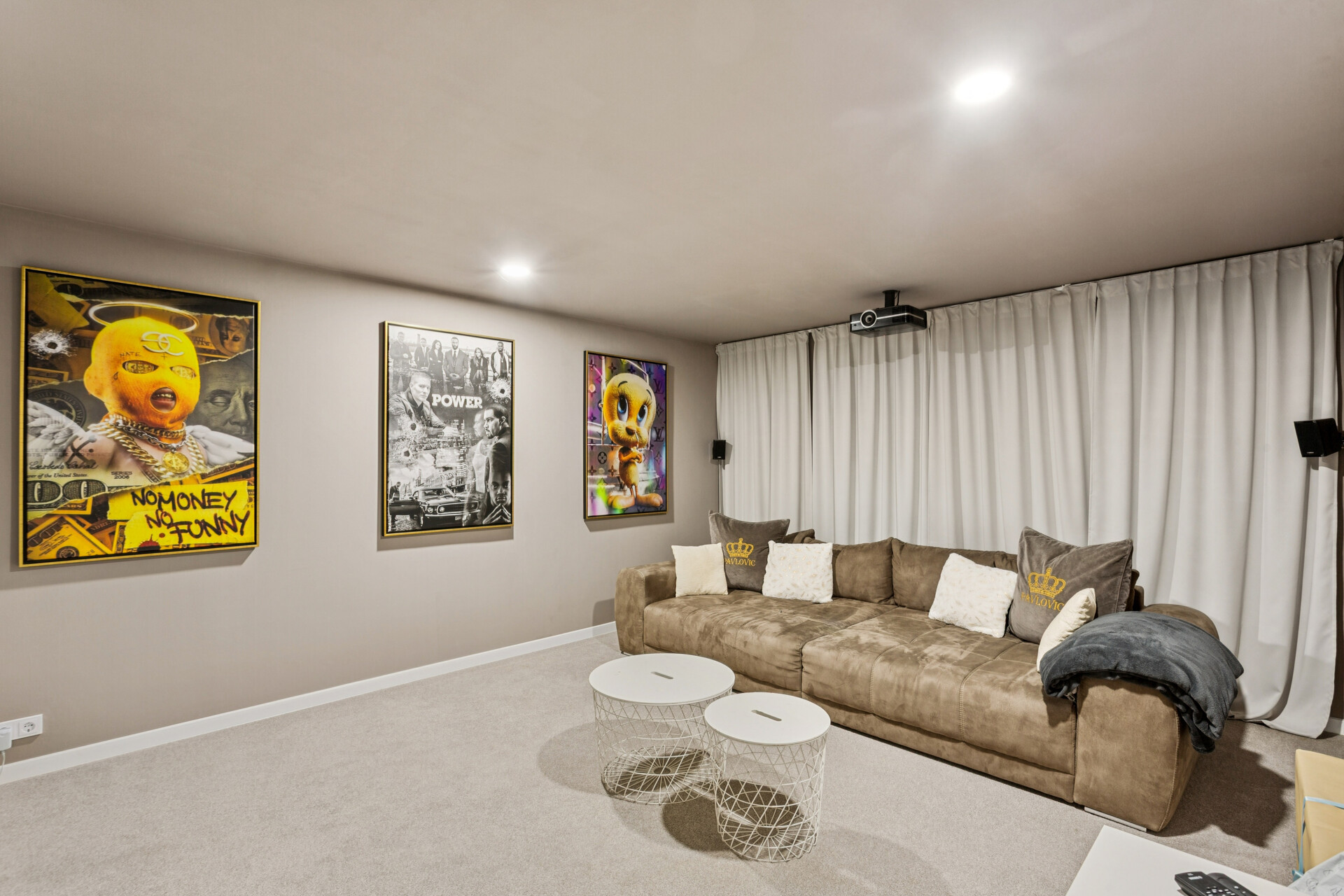 Die hochwertige Design-Küche ist mit modernster Premium-Technik ausgestattet, darunter ein Quooker Pro 3 Wasserfiltersystem, das auf Knopfdruck Sprudelwasser, gefiltertes Trinkwasser, kochendes und normales Wasser liefert. Ein besonderes Highlight ist das exklusive Heimkino, das unvergessliche Filmabende garantiert. Im gesamten Haus sorgt eine Fußbodenheizung für angenehme Wärme, während das integrierte Smart-Home-System mit Philips Hue Beleuchtung und elektrischen Jalousien bequem per App steuerbar ist.