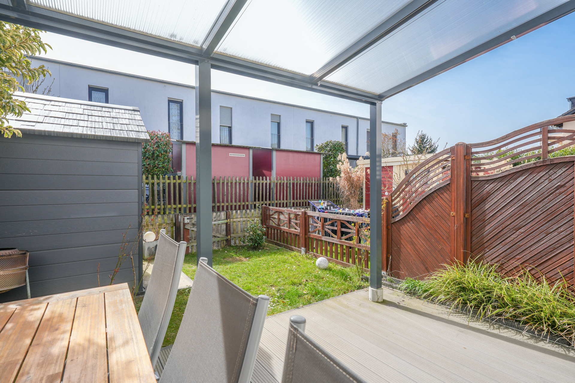 Der helle Wohnbereich bietet einen direkten Zugang zur überdachten Terrasse. Der anschließende Garten ist klar strukturiert und pflegeleicht angelegt, sodass er sowohl Erholung als auch Platz für individuelle Gestaltungsmöglichkeiten bietet