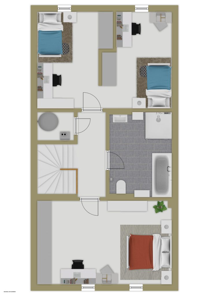 Im Obergeschoss erwarten Sie ein großzügiges Schlafzimmer sowie ein freundlich gestaltetes Kinderzimmer. Das Badezimmer überzeugt mit einer Lichtkuppel, einer komfortablen Badewanne und einer separaten Dusche – ideal für entspannende Wohlfühlmomente. Ein zusätzliches Gäste-WC im Erdgeschoss sorgt für weiteren Komfort.