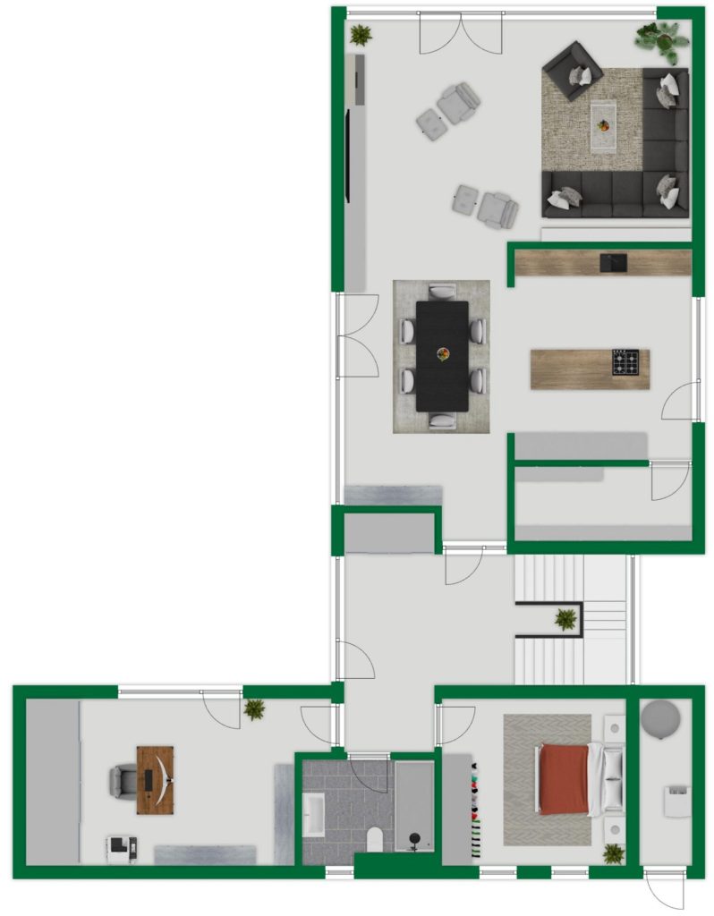 Das Haus erstreckt sich über Erd- und Obergeschoss und beeindruckt bereits beim Betreten mit seiner offenen, lichtdurchfluteten Gestaltung. Großzügige Glasflächen schaffen fließende Übergänge zwischen Innen- und Außenbereich, während hochwertige Materialien und ein fugenloser Boden ein modernes, harmonisches Gesamtbild erzeugen. Im Wohn- und Essbereich sorgt ein Kamin für behagliche Atmosphäre, während die offen gestaltete Küche mit Kochinsel, hochwertigen Einbauten und einem angrenzenden Vorratsraum überzeugt.