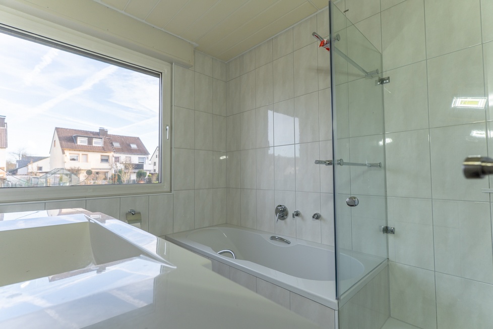 - Badausstattung: Dusche, Badewanne, Fenster im Badezimmer