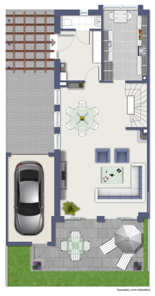 Der großzügige Eingangsbereich empfängt Sie freundlich und führt in den Wohn- und Essbereich mit Blick in den sonnigen Südgarten. Durch die großen Fensterfronten fällt reichlich Tageslicht ein und sorgt für eine helle, einladende Atmosphäre.