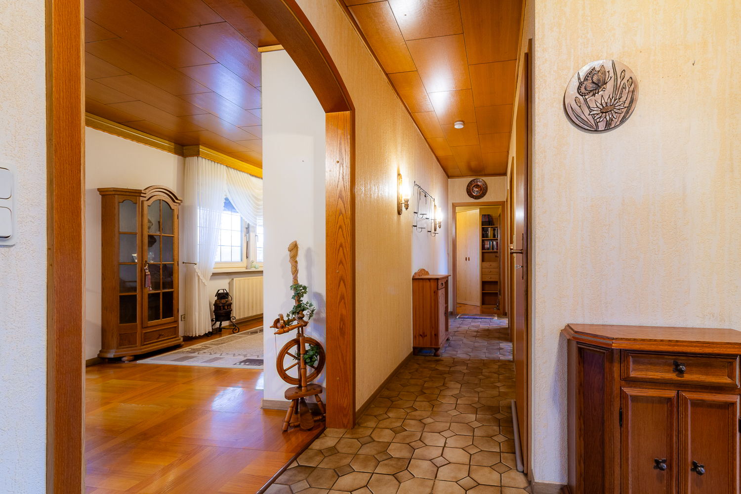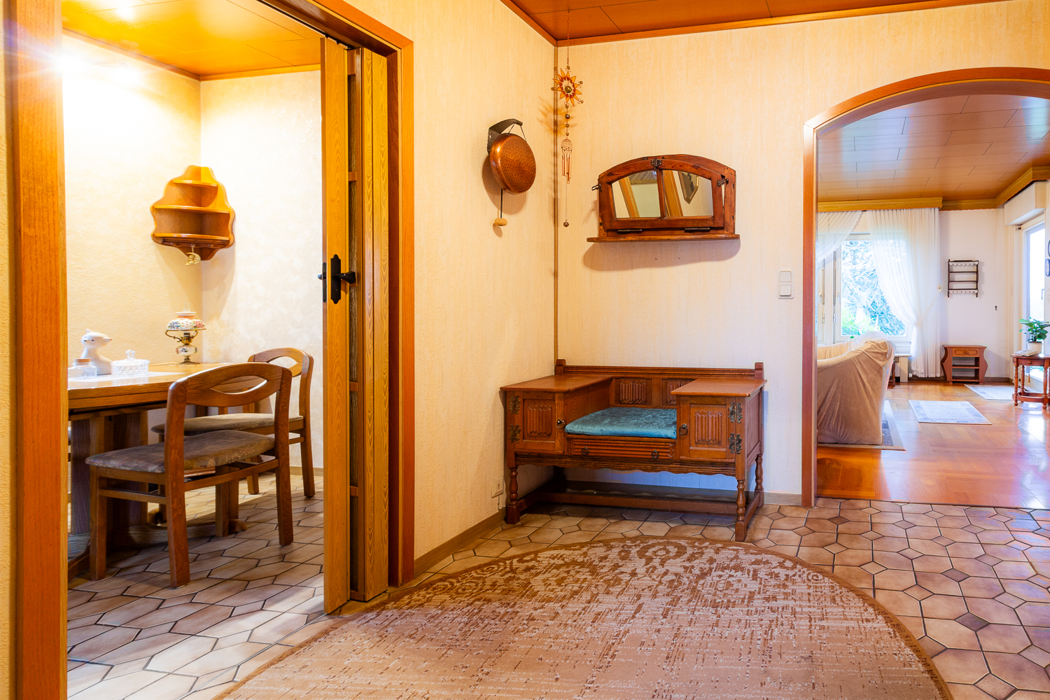Beim Betreten des Hauses gelangen Sie durch den Windfang in eine großzügige Diele, die als zentraler Mittelpunkt dient. Im vorgelagerten Windfang finden Sie das Gäste-WC und die bereits vorhandene Treppe ins derzeit ungenutzte Dachgeschoss.