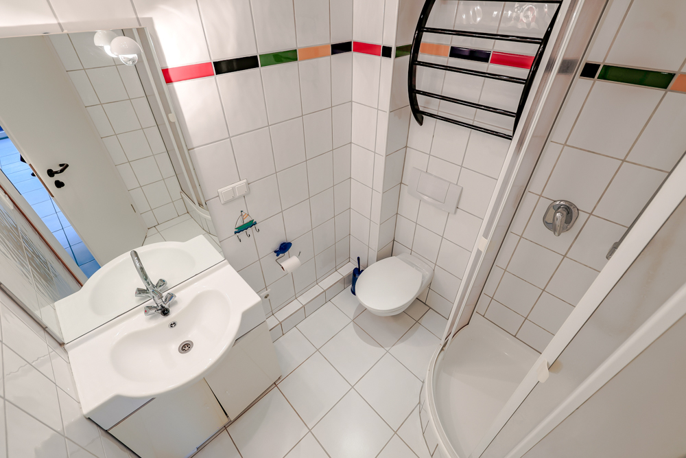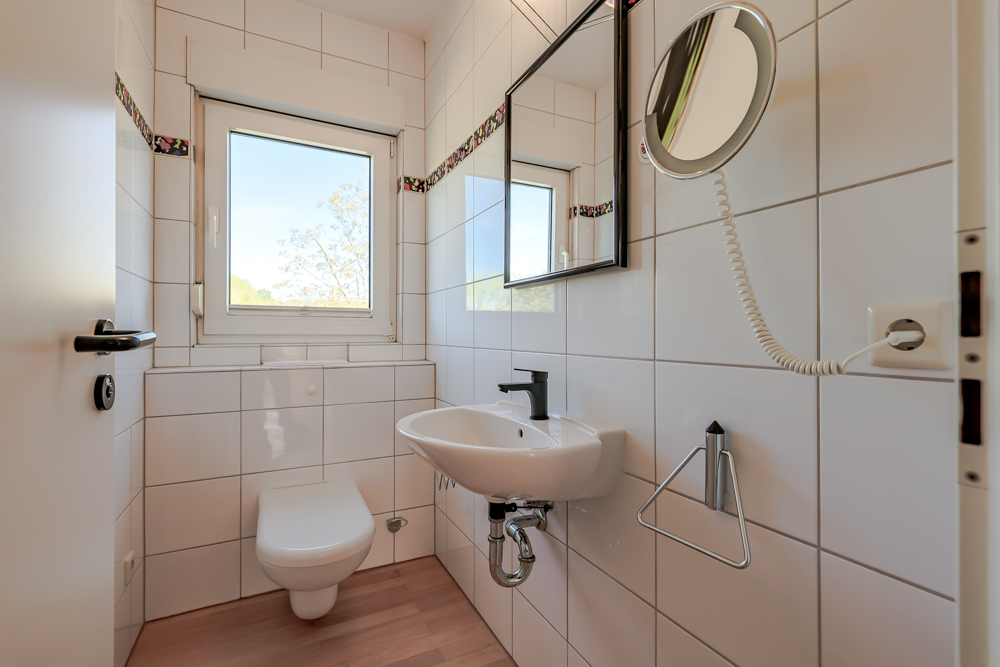 - Badausstattung: Dusche, Badewanne, Fenster im Badezimmer