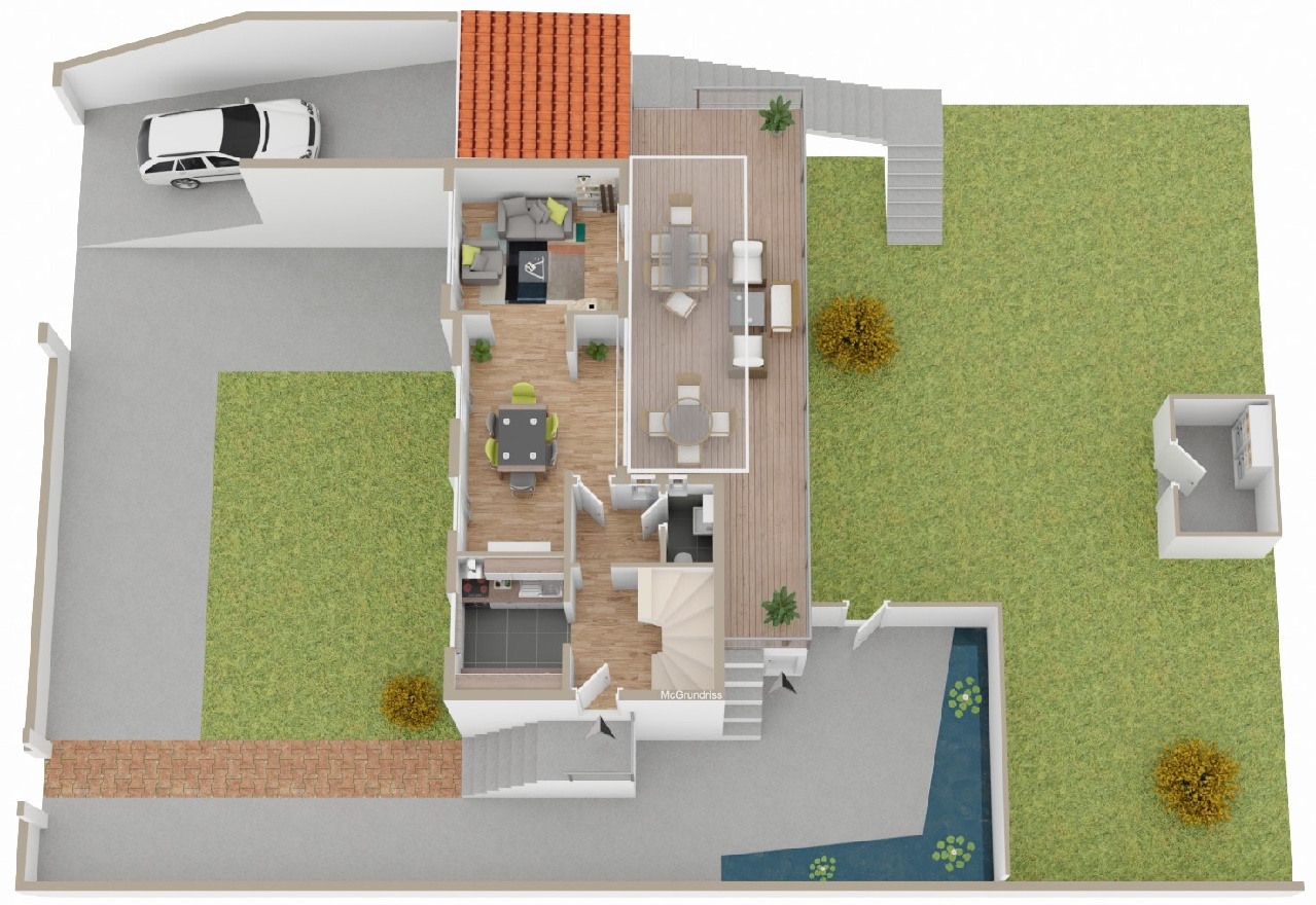 Rechts vom Haus, neben dem Zugang des Haupthauses, gelangen Sie über wenige Stufen in den Garten sowie zum Anbau. Der Anbau befindet sich auf der Garteneben mit eigenem Zugang und bettet sich zwischen einem liebevoll angelegten Fischteich mit Wasserlauf und dem weiteren Gartenbereich ein. Der Anbau lässt sich als separate Einliegerwohnung nutzen. Dieser verfügt über zwei hintereinander liegende Zimmer, ein kleines Badezimmer mit Dusche und eine kleine Küche.
