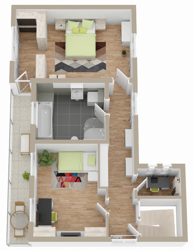- Badausstattung: Dusche, Badewanne