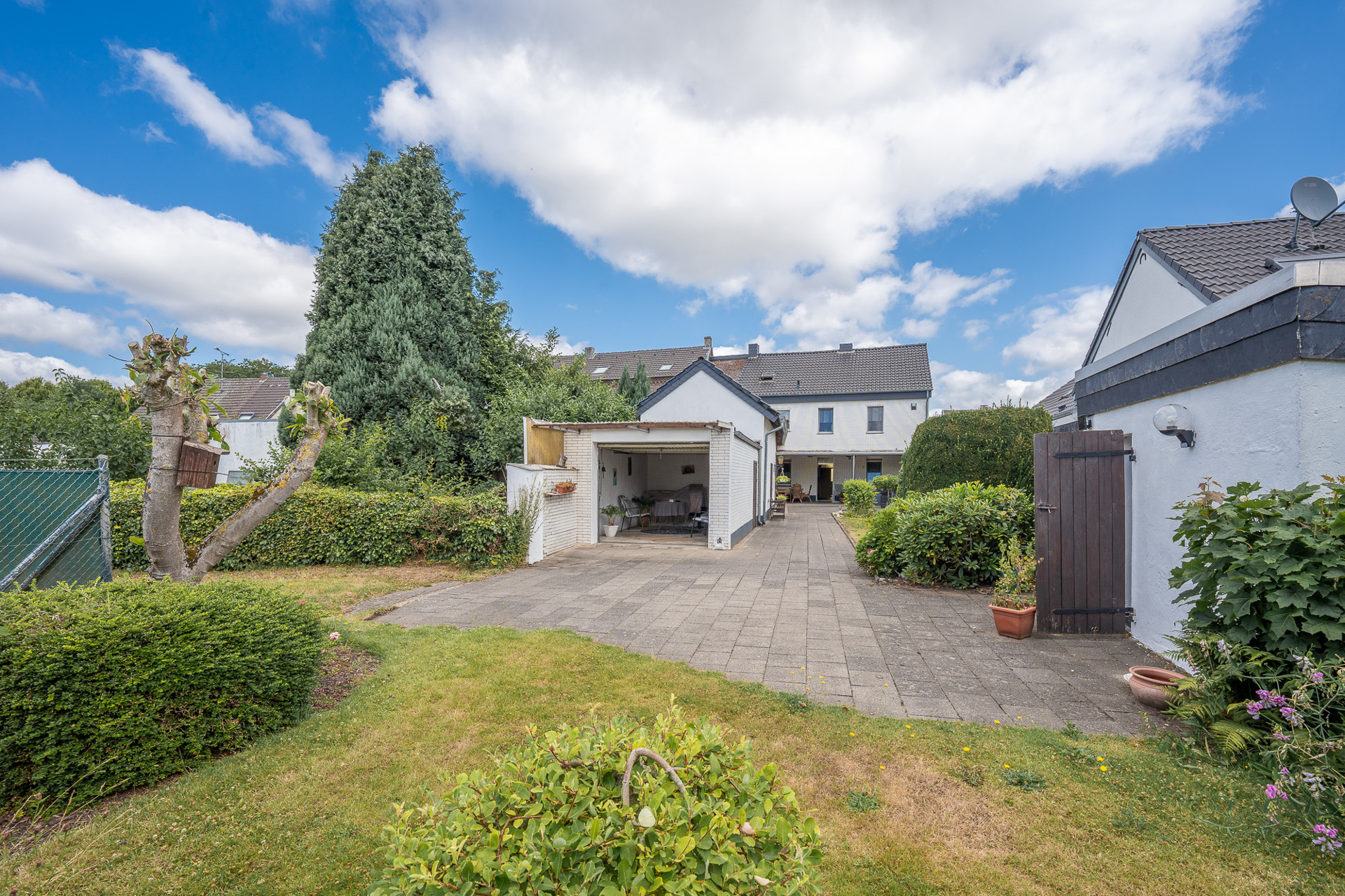 Das Haus steht auf einem großzügigen 694 m² großen Grundstück, das neben Freiflächen auch praktische Abstellräume im Außenbereich bereithält. Für zusätzlichen Stauraum sorgt die Teilunterkellerung, die bequem über die überdachte Terrasse zugänglich ist – eine durchdachte Lösung für Alltag und Vermietung.