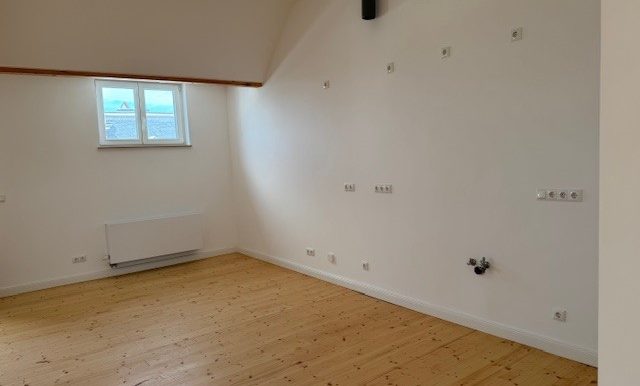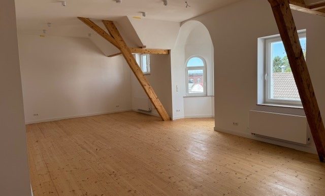 Diese außergewöhnlich großzügige und lichtdurchflutete 2-Zimmer-Dachgeschosswohnung mit ca. 120 m² Wohnfläche bietet exklusives Wohnen auf hohem Niveau. Die Wohnung befindet sich im obersten Geschoss eines gepflegten Mehrfamilienhauses und vereint offene Raumgestaltung mit modernem Wohnkomfort. Der weitläufige Wohn- und Essbereich beeindruckt durch seine offene Architektur, große Fensterflächen und die angenehme Raumhöhe mit Sichtbalken, die dem Raum eine besondere Atmosphäre verleihen. Die Wohnung verfügt über ein geräumiges Schlafzimmer mit viel Platz für Schrank- und Stauraummöglichkeiten. Die moderne Küche ist offen zum Wohnbereich gestaltet und kann nach individuellen Vorstellungen eingerichtet werden. Das stilvoll geflieste Badezimmer ist mit einer Badewanne sowie einer separaten Dusche ausgestattet und bietet ebenfalls Tageslicht.