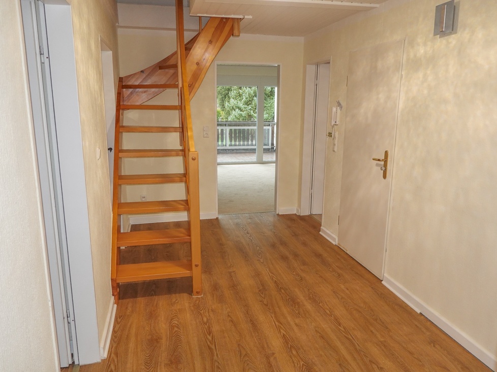 Bodenbeläge: Küche gefliest, Diele und Schlafzimmer durchgehend Vinyl, Badezimmer Vinyl, Spitzboden Laminat