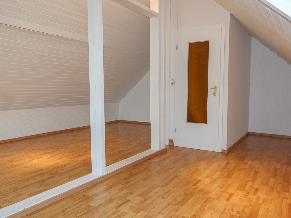 Zurück in der Wohnungsdiele gelangen Sie über eine Treppe in den ausgebauten Spitzboden. Auch wenn dieser Bereich eigentlich als Kellerersatzraum dient, könnten Sie den Spitzboden aufgrund des wohnlichen Charakters und der guten Belichtung durch ein Dachflächenfenster und ein großes Giebelfenster auch als Arbeitszimmer nutzen. Hierfür müssten Sie hier lediglich zum Beispiel eine weitere Infrarotheizung installieren.