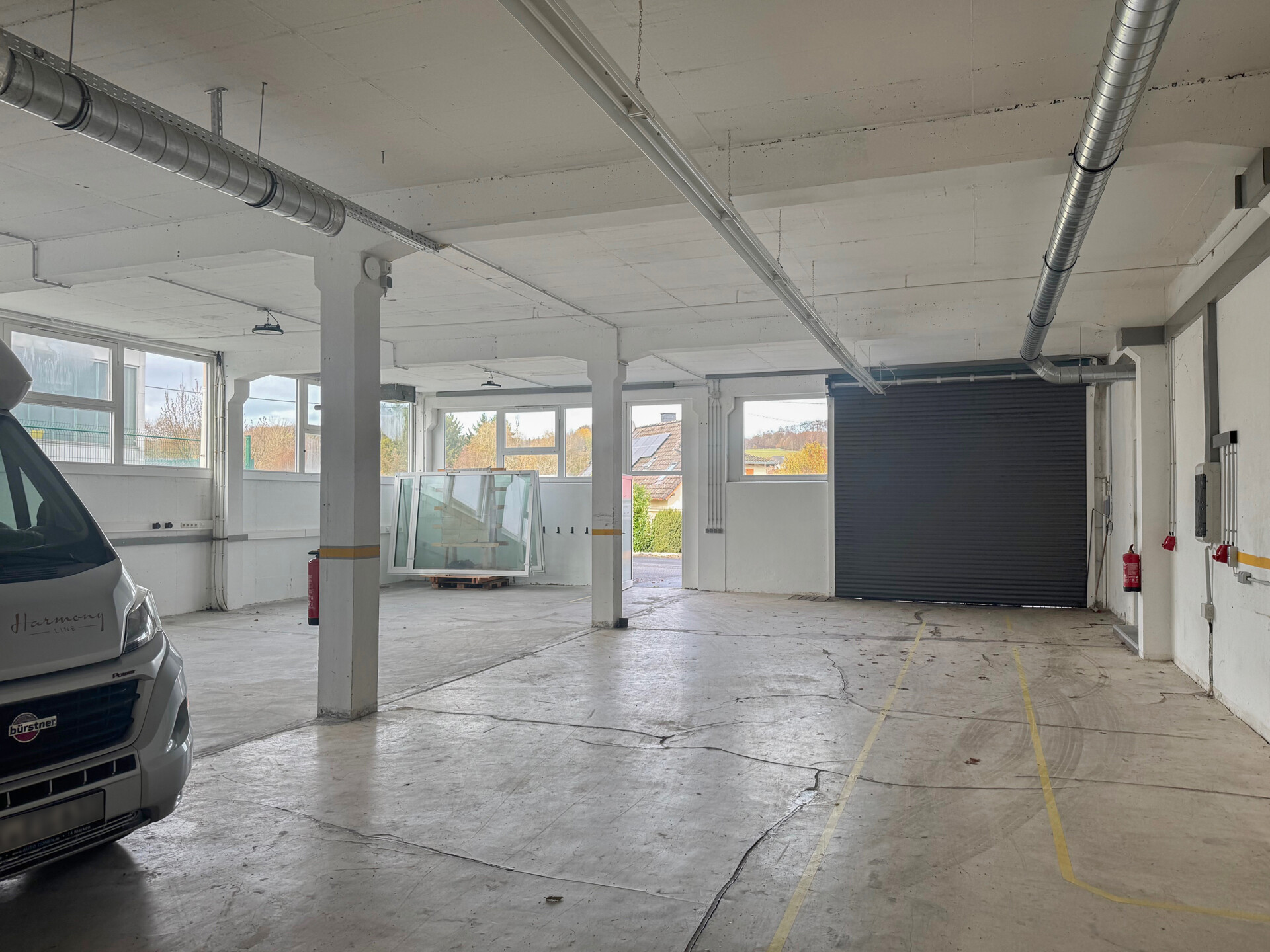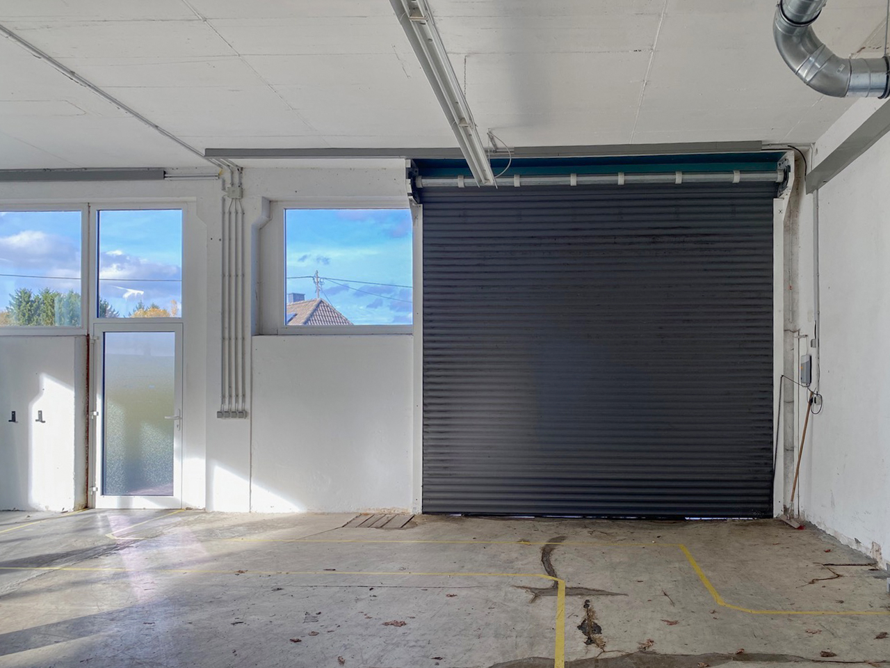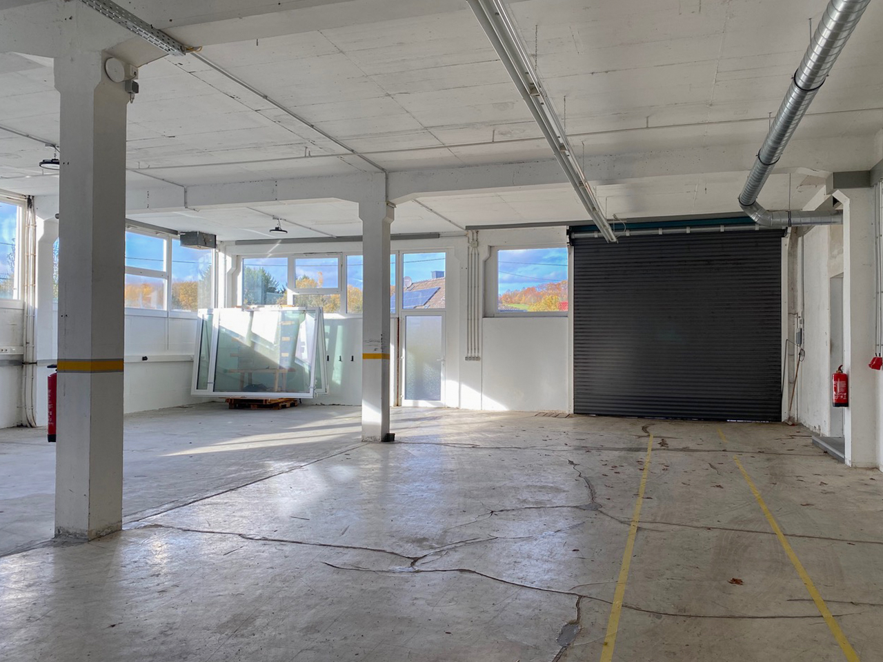 Die Halle verfügt über eine angenehme Deckenhöhe, gute Belichtung und ist für verschiedene Nutzungsarten geeignet – von Produktion über Montage bis hin zur Lagerhaltung.