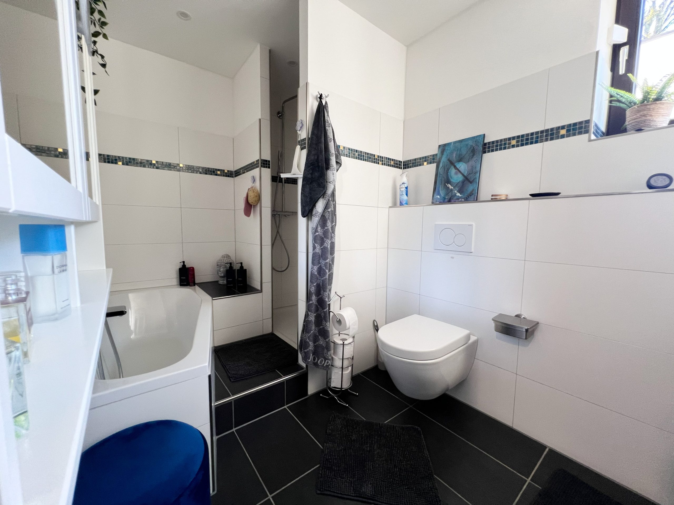- Badausstattung: Dusche, Badewanne, Fenster im Badezimmer