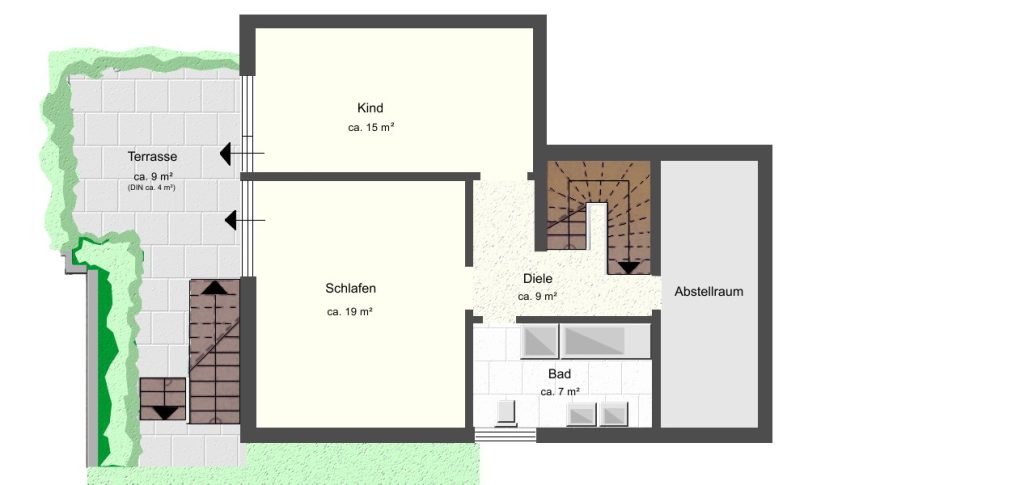 Untergeschoss: zwei Zimmer, Diele, Bad, Hauswirtschaftsraum, Zugang zum Garten