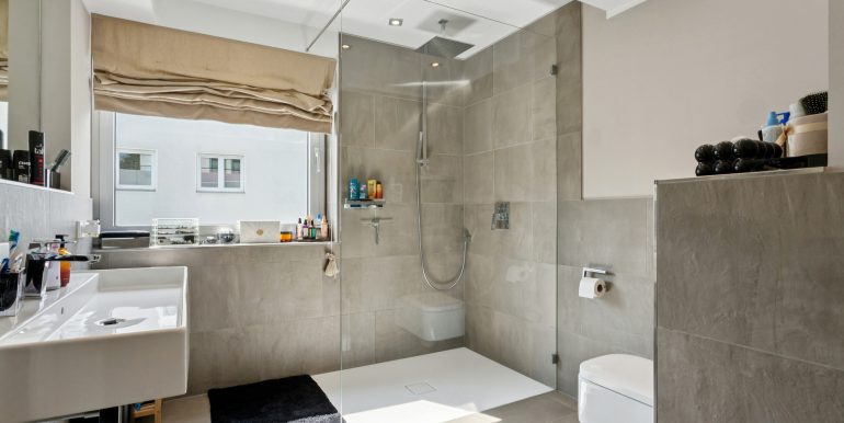 Das neu gestaltete Badezimmer ist mit einer bodentiefen Dusche ausgestattet und hochwertig gefliest. Zusätzlich steht ein separates Gäste-WC zur Verfügung.