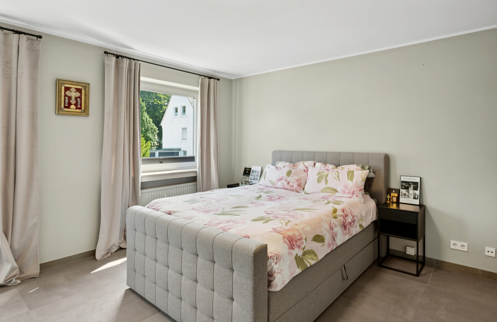Das neu gestaltete Badezimmer ist mit einer bodentiefen Dusche ausgestattet und hochwertig gefliest. Zusätzlich steht ein separates Gäste-WC zur Verfügung.