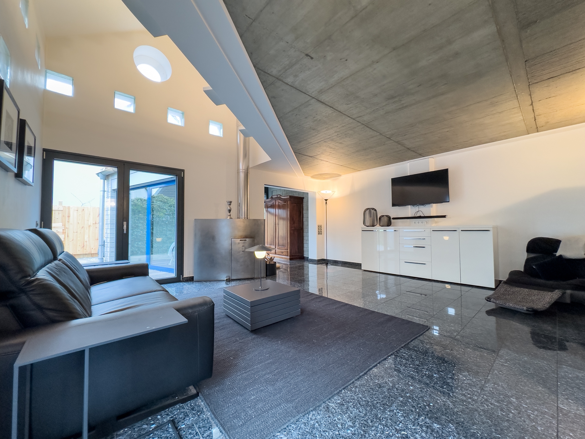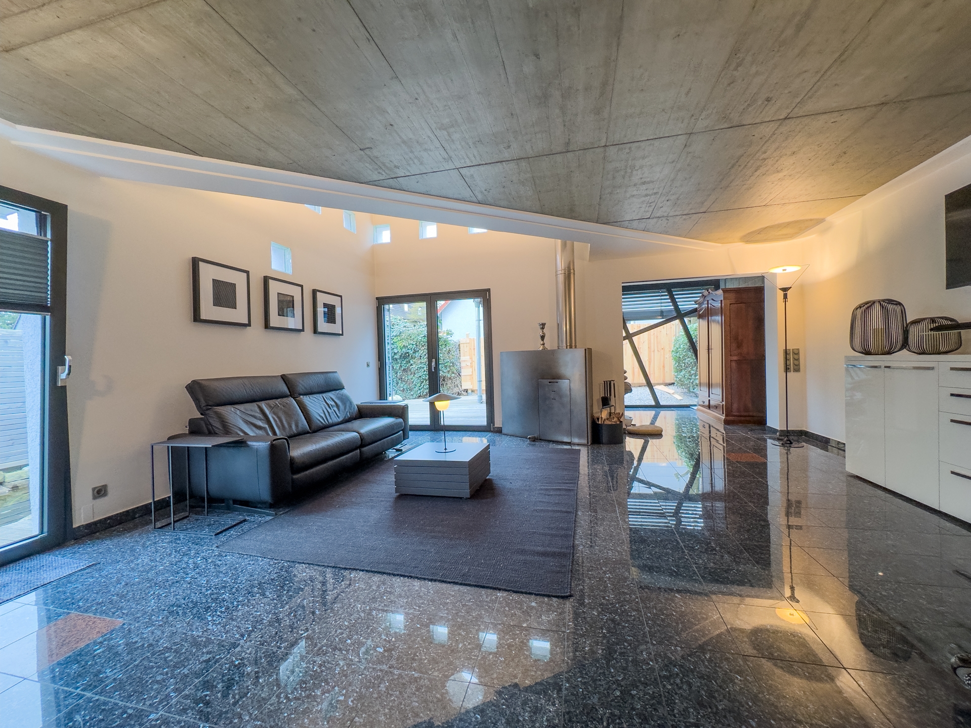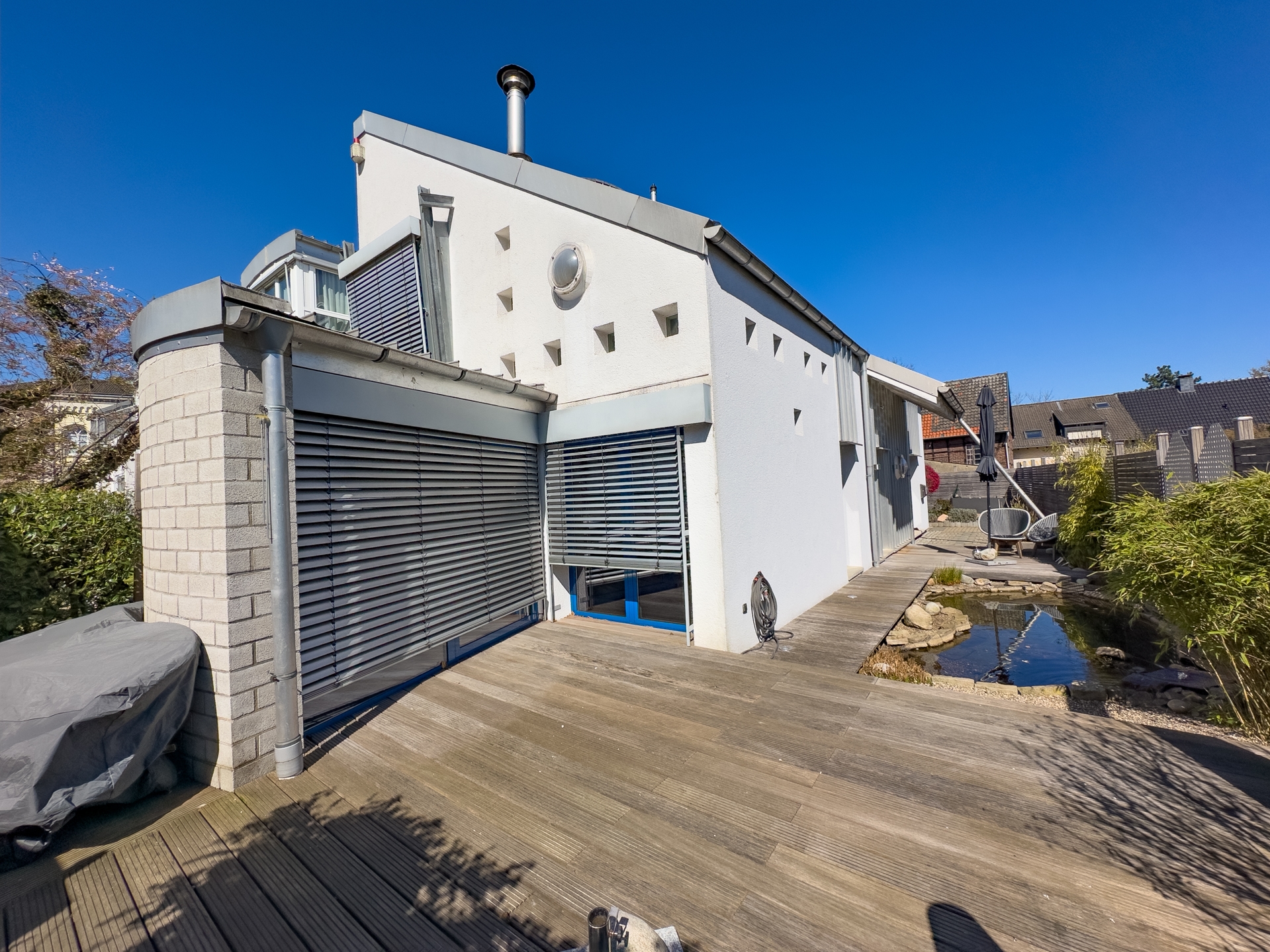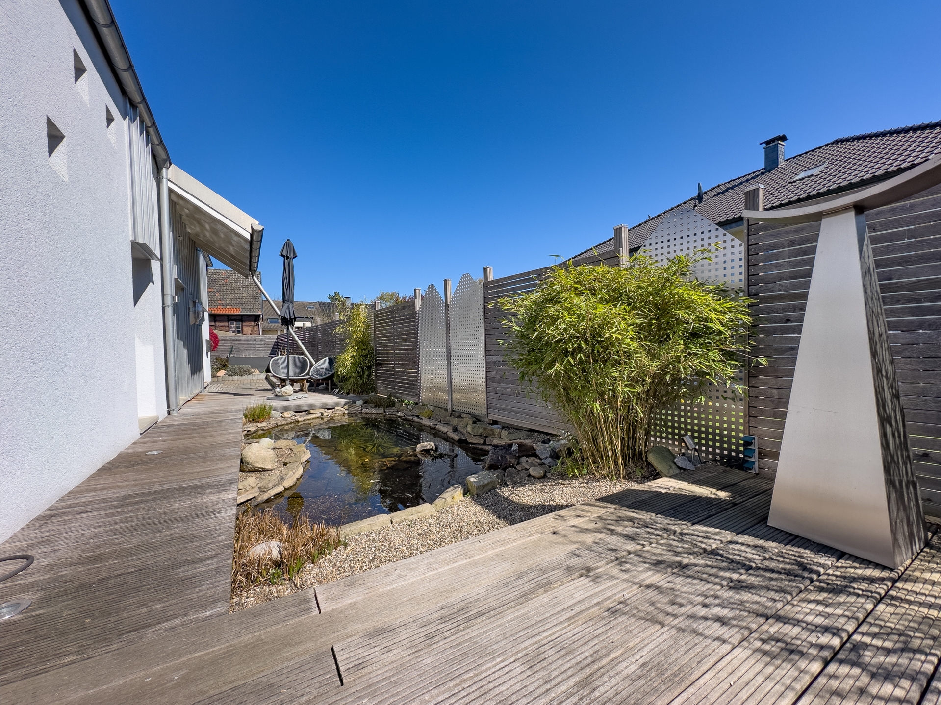 Willkommen in Ihrer neuen Traumwohnung, die durch moderne Ausstattung und stilvolle Designelemente besticht. Diese exquisite Wohnung ist als Anbau an ein Mehrfamilienhaus konzipiert und bietet Ihnen die perfekte Kombination aus privatem Rückzugsort und geselligem Leben. Der eigene Gartenteil ist ein wahres Paradies für Naturliebhaber. Ein kleiner Teich, umgeben von üppigem Grün, lädt zum Verweilen und Entspannen ein. Das großzügige Holzdeck ist der ideale Ort für Sonnenliegen und bietet ausreichend Platz für eine Outdoorküche perfekt für gesellige Grillabende mit Freunden und Familie. Betreten Sie das lichtdurchflutete Erdgeschoss, wo die offene Küche mit einem einladenden Essplatz auf Sie wartet. Bodentiefe Fenster ermöglichen einen nahtlosen Übergang zur Terrasse und lassen viel Tageslicht herein. Ein stilvolles Gäste-WC sorgt für zusätzlichen Komfort. Das Wohnzimmer, ausgestattet mit einem edlen Design-Edelstahlkamin, ist ein Highlight, das Gemütlichkeit und Eleganz vereint. Ein flexibler Fitness- oder Arbeitsbereich mit direktem Zugang zur Terrasse rundet das Erdgeschoss ab und bietet die Möglichkeit, Arbeit und Freizeit harmonisch zu verbinden. Im Obergeschoss erwarten Sie zwei geschmackvoll gestaltete Räume. Ein modernes Gäste-Badezimmer mit Dusche sorgt für Komfort und Privatsphäre. Ein besonderes Highlight ist die Galerie, die sich ideal als Homeoffice eignet und Ihnen einen inspirierenden Arbeitsplatz bietet. Das Kinderzimmer bietet zwei coole Schlafkojen die jeweils über eine Leiter zu erreichen sind. Das Schlafzimmer ist ein Rückzugsort der Extraklasse, ausgestattet mit einem direkten Zugang zum luxuriösen Wellnessbadezimmer hier können Sie nach einem langen Tag entspannen und neue Energie tanken. Der Keller bietet nicht nur praktische Lagermöglichkeiten, sondern auch eine eigene Sauna mit Dusche Ihr persönlicher Wellnessbereich. Zudem gelangen Sie bequem in die geräumige Tiefgarage, die ausreichend Platz für Ihr Fahrzeug, Fahrräder eine Brauchwasseranlage (Regenwasser) und andere Dinge bietet. Dieses moderne Haus verbindet stilvolles Wohnen mit einem hohen Maß an Lebensqualität. Die durchdachte Raumaufteilung, die hochwertigen Materialien und die zahlreichen Designelemente schaffen eine harmonische Atmosphäre, die zum Verweilen und Genießen einlädt. Überzeugen Sie sich selbst von diesem einzigartigen Angebot und vereinbaren Sie noch heute einen Besichtigungstermin. Ihr neues Zuhause wartet auf Sie!