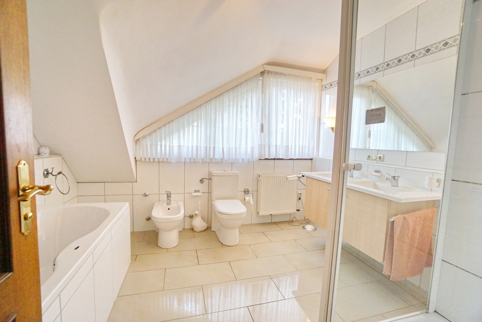- Badausstattung: Dusche, Badewanne, Fenster im Badezimmer