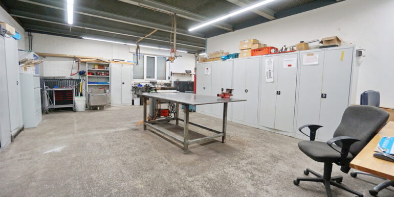 Sektionaltore ermöglichen den einfachen An- und Abtransport von Produkten. Darüber hinaus stehen Ihnen großzügige Büro- und Mitarbeiterräume sowie Aufenthaltsräume zur Verfügung, die eine angenehme Arbeitsatmosphäre schaffen.