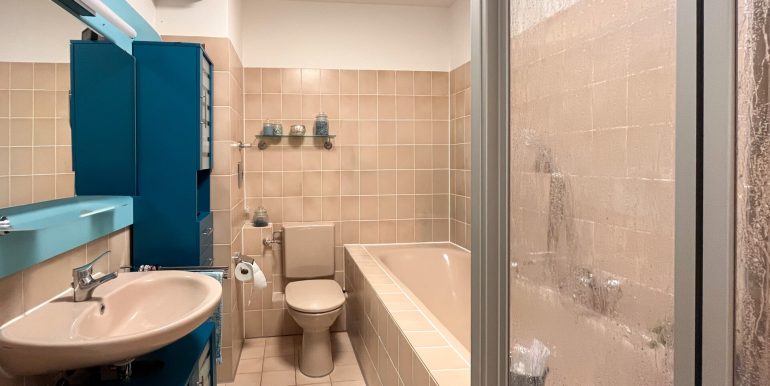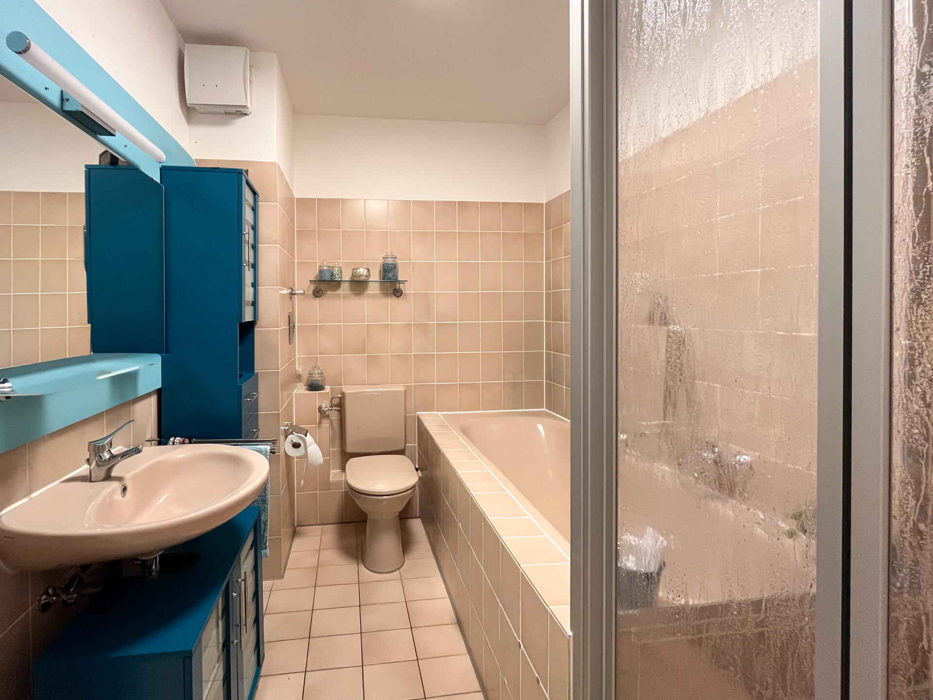 Das Badezimmer ist mit einer Badewanne, einer separaten Dusche und einem WC ausgestattet.