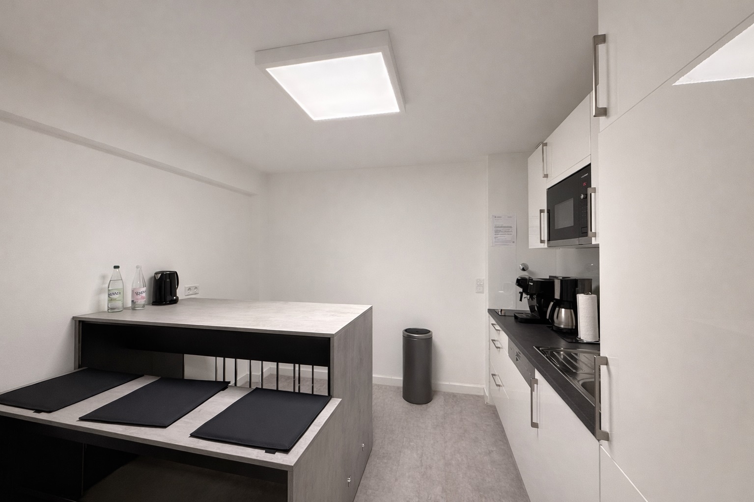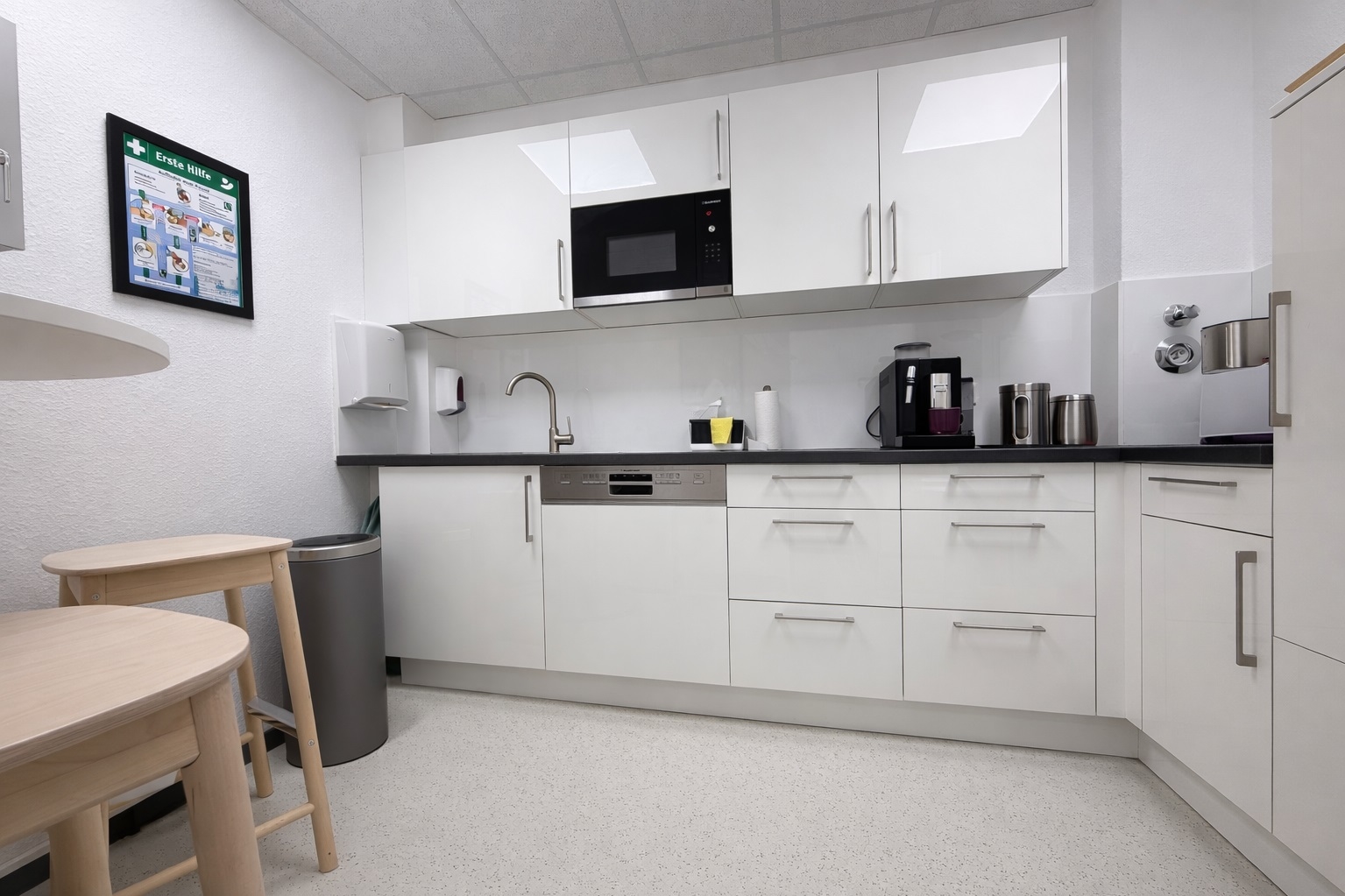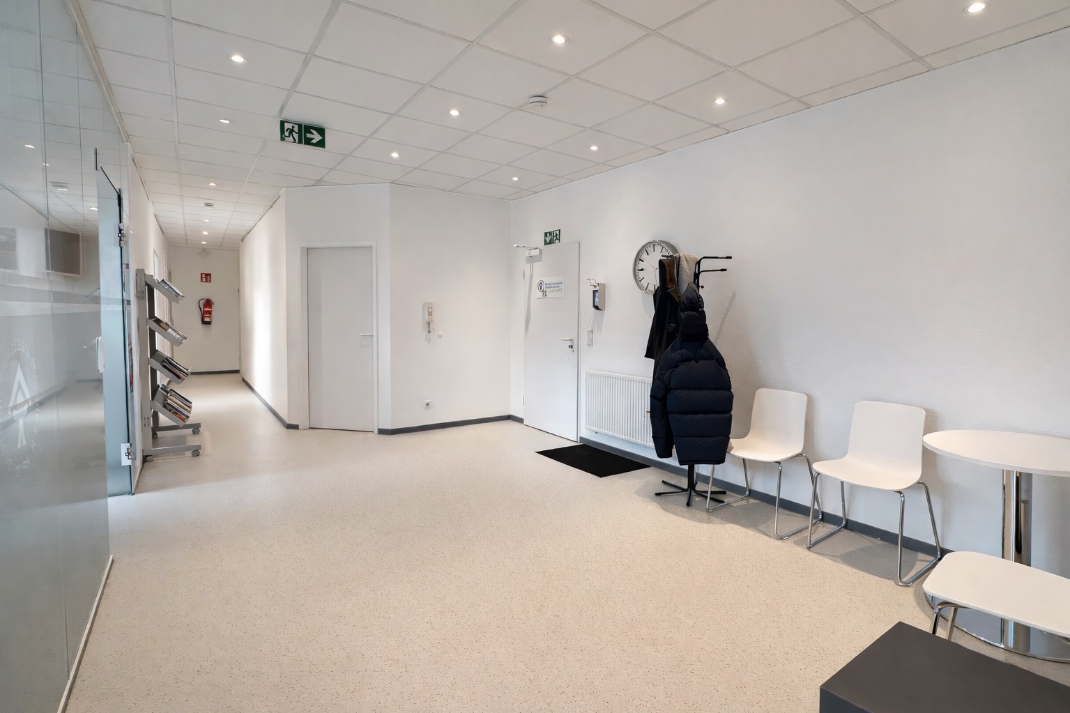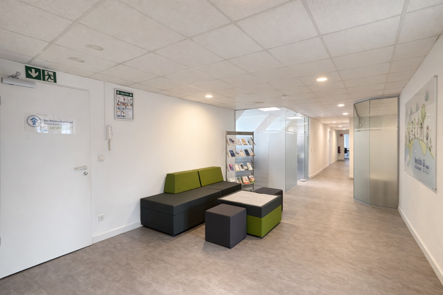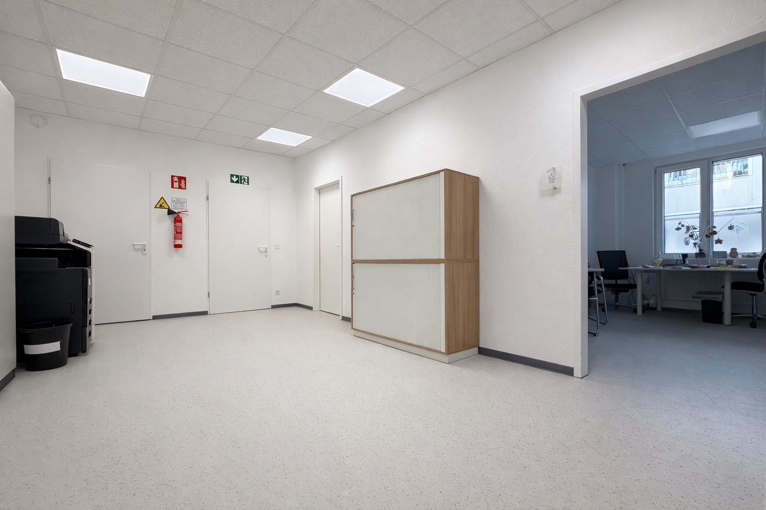 Die Ausstattung der Flächen präsentiert sich in einem gepflegten und zeitgemäßen Zustand. Helle Wandflächen, moderne Bodenbeläge sowie eine abgehängte Rasterdecke mit integrierter Beleuchtung schaffen eine professionelle und angenehme Arbeitsatmosphäre.