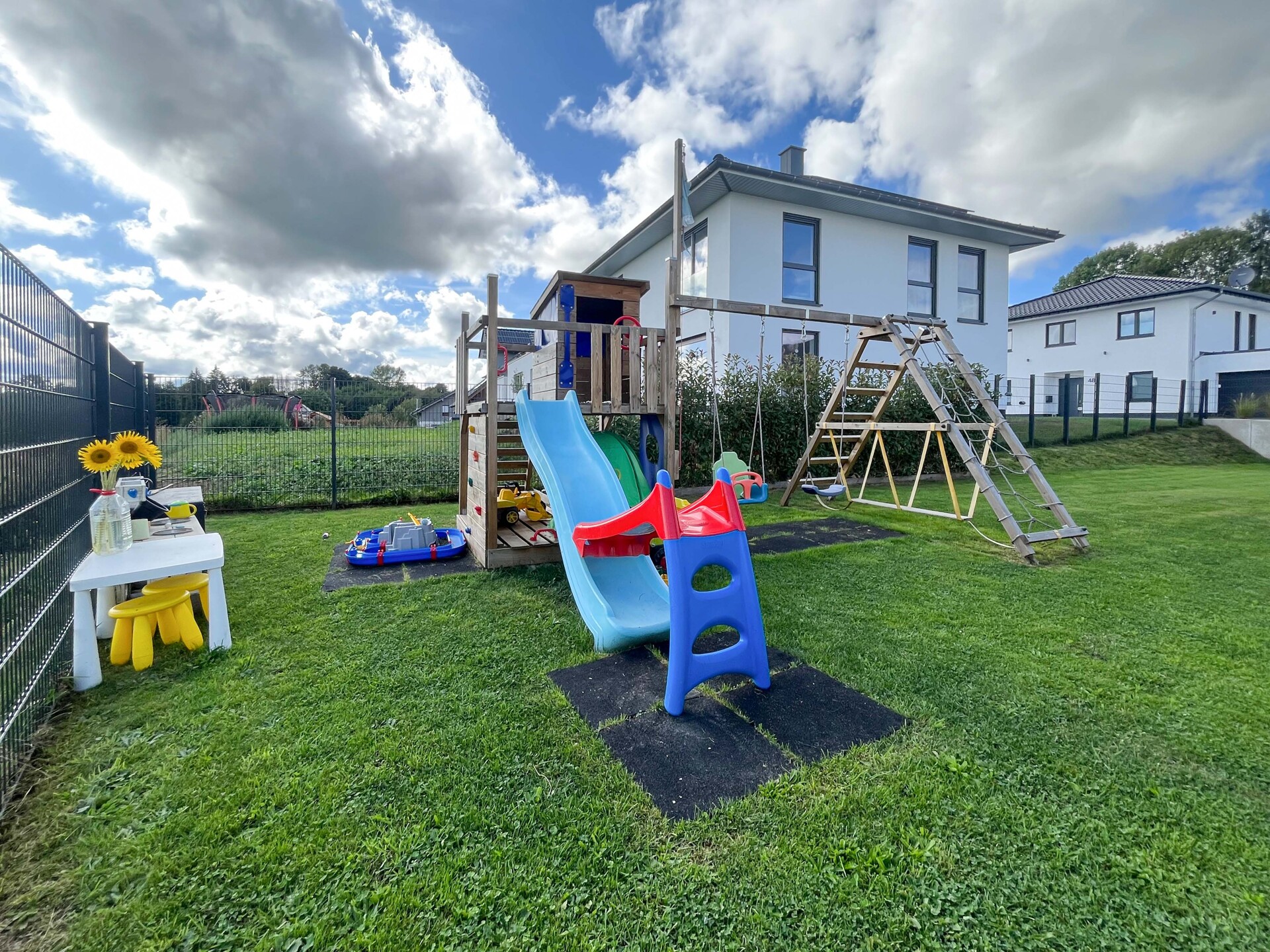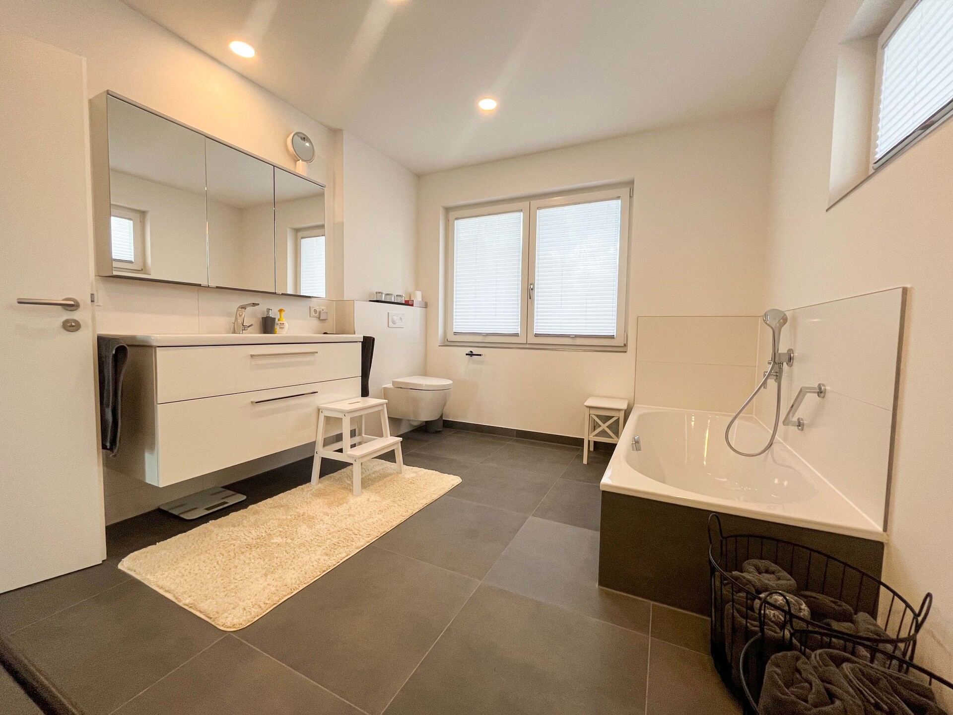 Im Obergeschoss erwarten Sie zwei Kinderzimmer, ein Schlafzimmer mit angrenzendem Ankleidezimmer, ein großzügiges Badezimmer mit Badewanne und Dusche sowie ein zusätzlicher Fitnessraum. Damit bietet das Haus ideale Voraussetzungen für Familien, die Wert auf Funktionalität und Komfort legen.