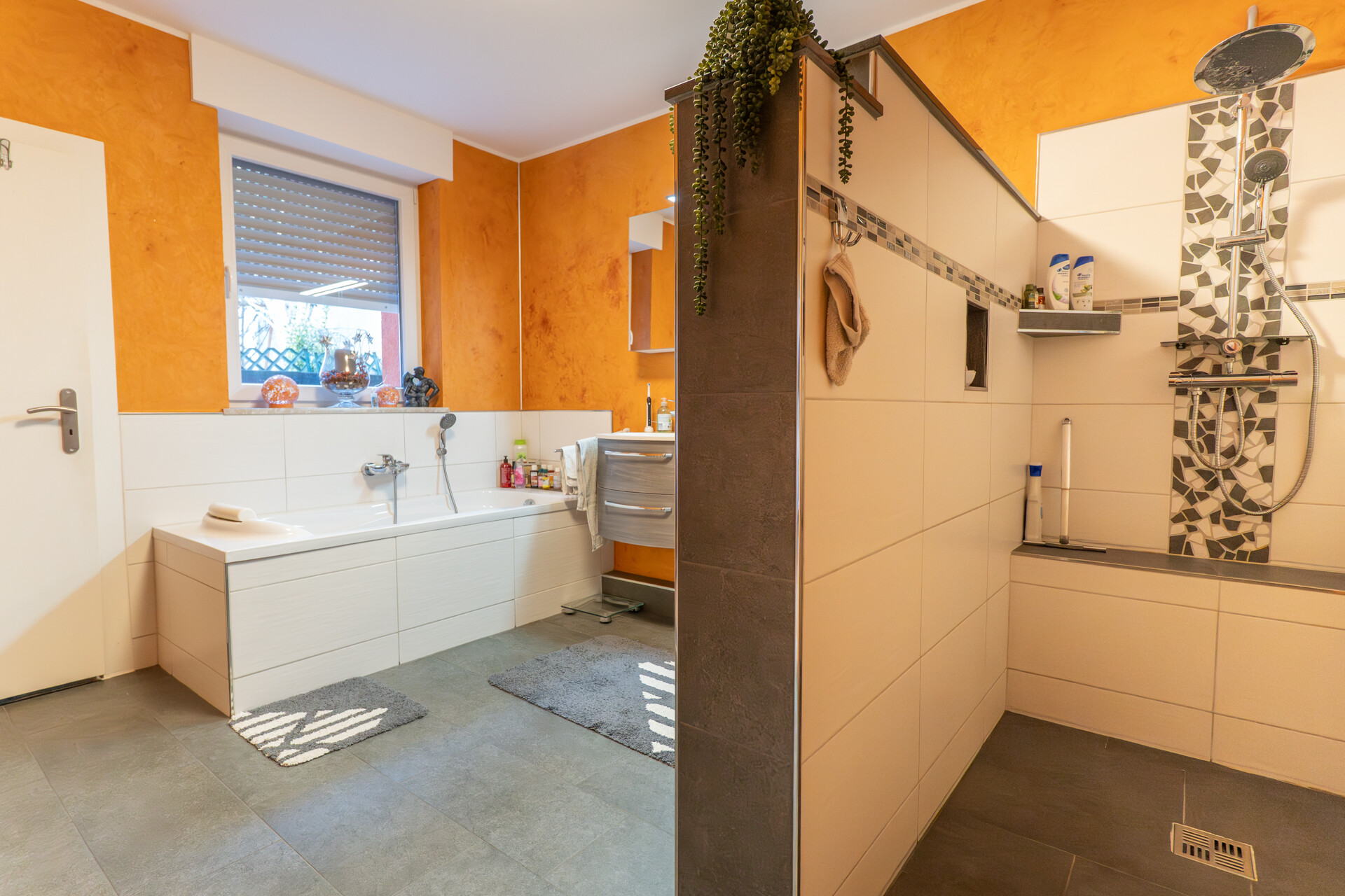 EG Tageslichtbad mit großer Walk-In- Dusche sowie separates WC mit Fenster. DG Tageslichtbad mit Dusche