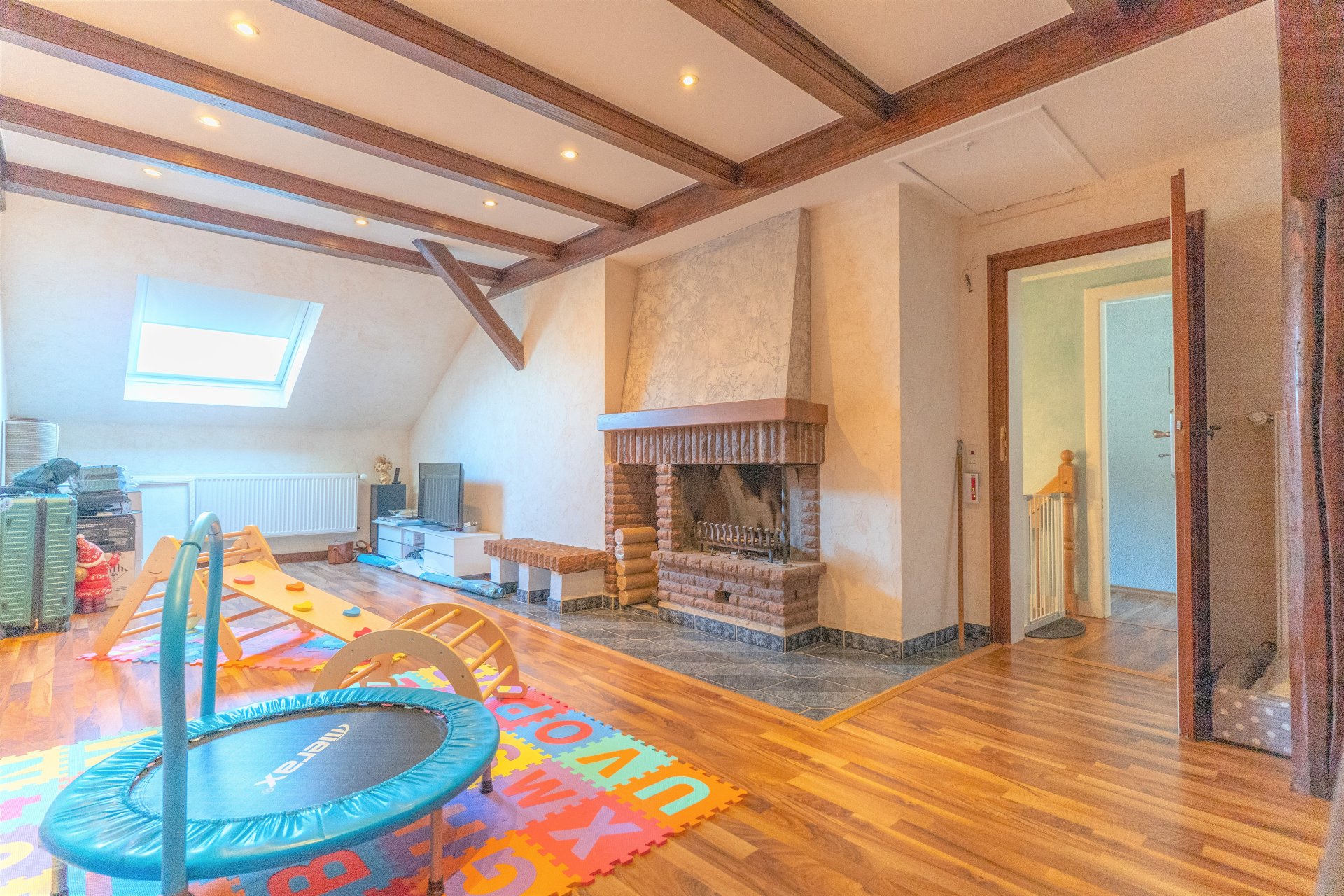 Im Dachgeschoss befindet sich auf der rechten Seite ein großzügiges Wohn-/ und Esszimmer mit offenem Kamin, das eine besonders angenehme Wohnatmosphäre schafft. Auf der linken Seite sind über eine Zwischendiele aktuell drei Schlafzimmer sowie ein ebenfalls modernes Tageslichtbad mit Dusche erreichbar. Im Falle einer Nutzung als Zweifamilienhaus kann eines der Schlafzimmer ohne größeren Aufwand zu einer Küche umgebaut werden.