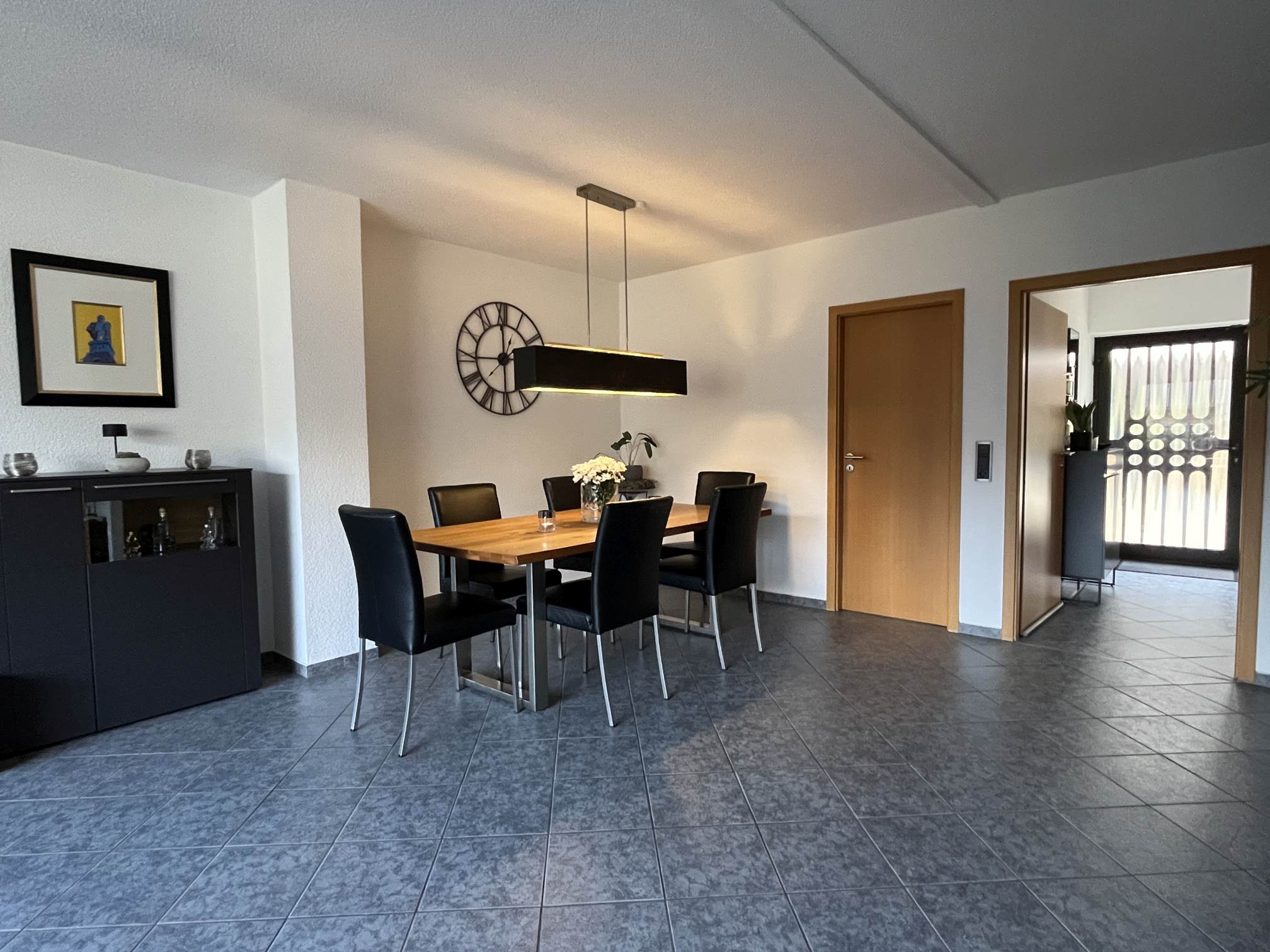 Die Ausstattung präsentiert sich aktuell wie aus dem Ei gepellt – das Haus wurde in 2002 umfassend modersinisert: u. a. blau-graue Bodenfliesen im EG, Laminat im OG, neue Innentüren, Wände mit Rauhfaserputz versehen, Treppenhaus modernisiert, Bad und Gäste-WC ebenfalls aus 2002. Lediglich das Bad im DG, die Fenster und die Heizung sind noch aus dem Baujahr. Die Markise über der Terrasse wurde erst in 2025 erneuert. Die schicke Einbauküche ist ebenfalls bereits im Kaufpreis enthalten.